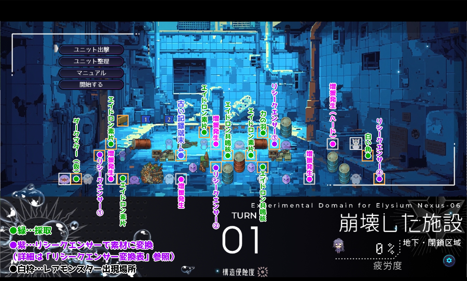 ・エイドロン素片(幸運のお守り無し:30% 幸運のお守り有:100%) ・丈夫な青い皮 ●14ターン未満 ∟(幸運のお守り無し:30% 幸運のお守り有:50%) ●14ターン以降 ∟(幸運のお守り無し:60% 幸運のお守り有:100%) |