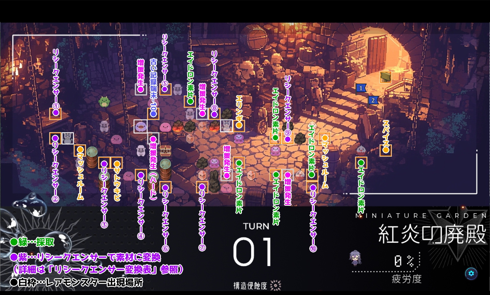 ・エイドロン素片(幸運のお守り無し:30% 幸運のお守り有:100%) ・不思議な植物D ●14ターン未満 ∟(幸運のお守り無し:30% 幸運のお守り有:50%) ●14ターン以降 ∟(幸運のお守り無し:60% 幸運のお守り有:100%) |