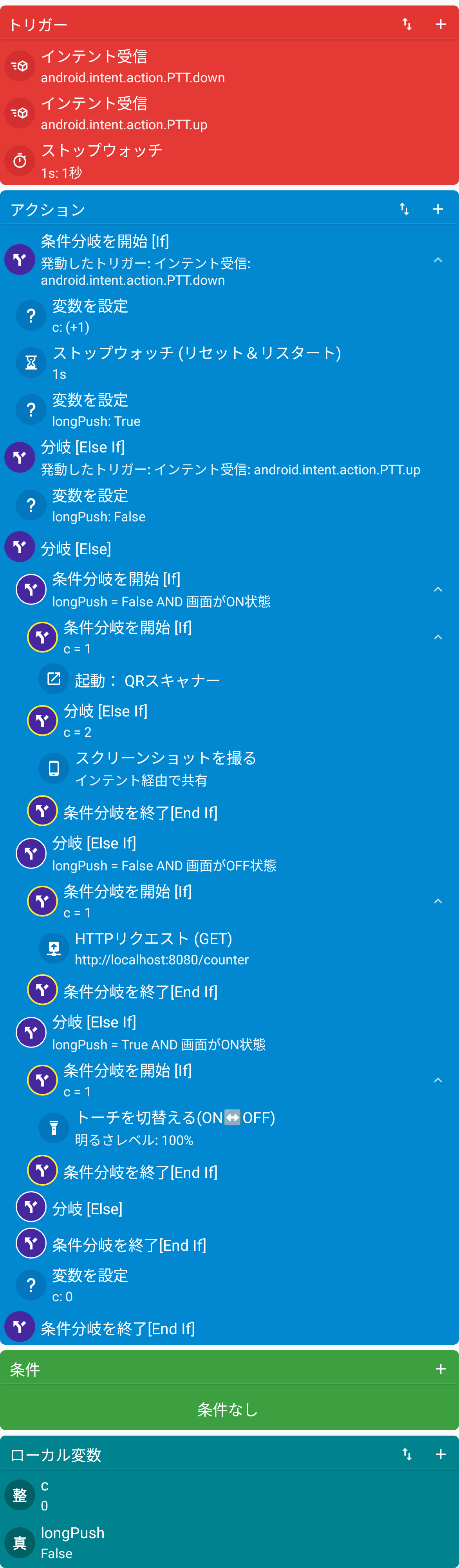 これで、プログラマブルキーを押したとき、離したときにそれぞれIntentが送信されるようになり、MacroDroid側でインテント受信トリガーを使って操作できるようになります。