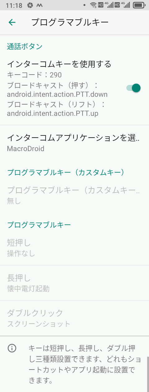 インターコムキーを使用するをONにすると本体機能が無効になり、外部アプリ連携用のIntentが確認できるようになります。(次項でアプリを設定しないと動作しません)