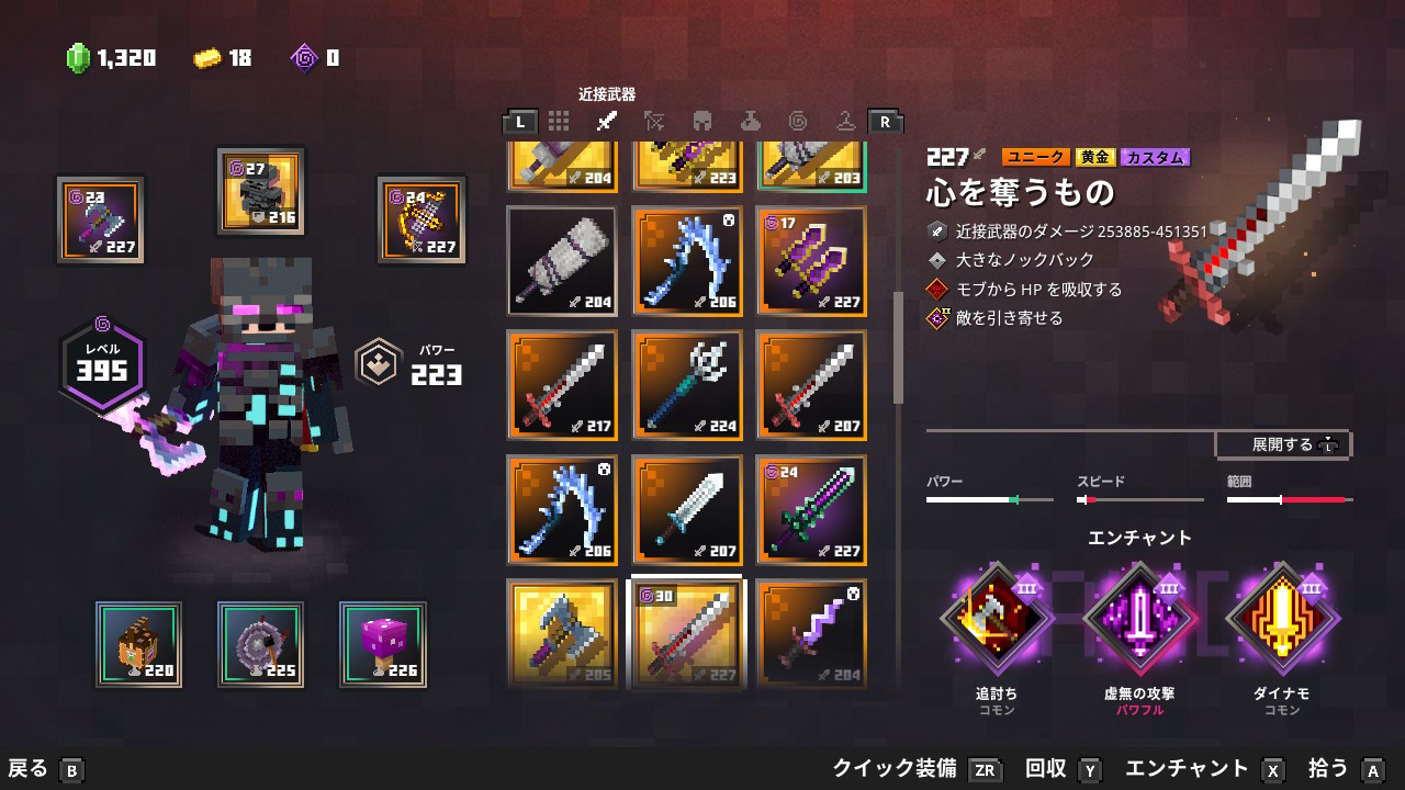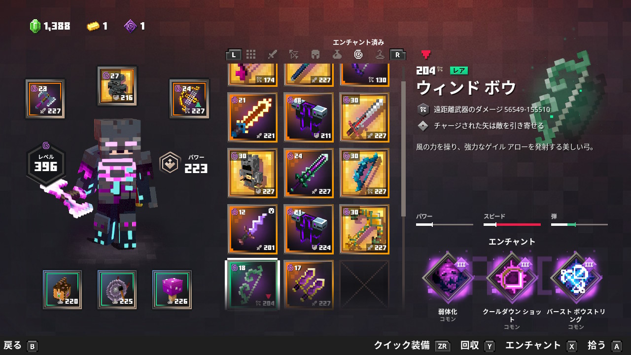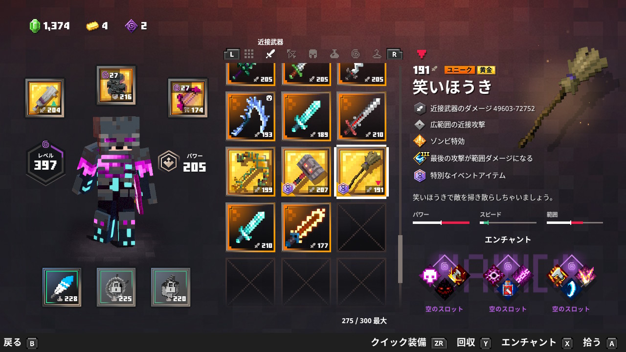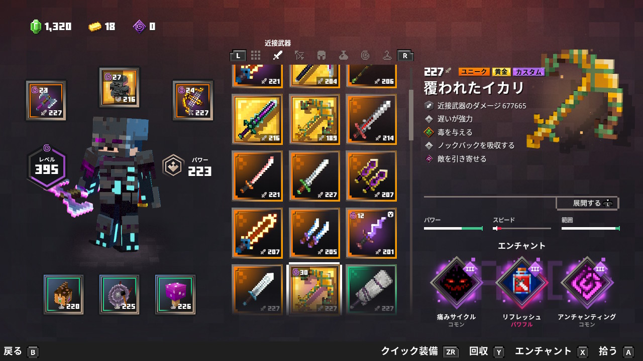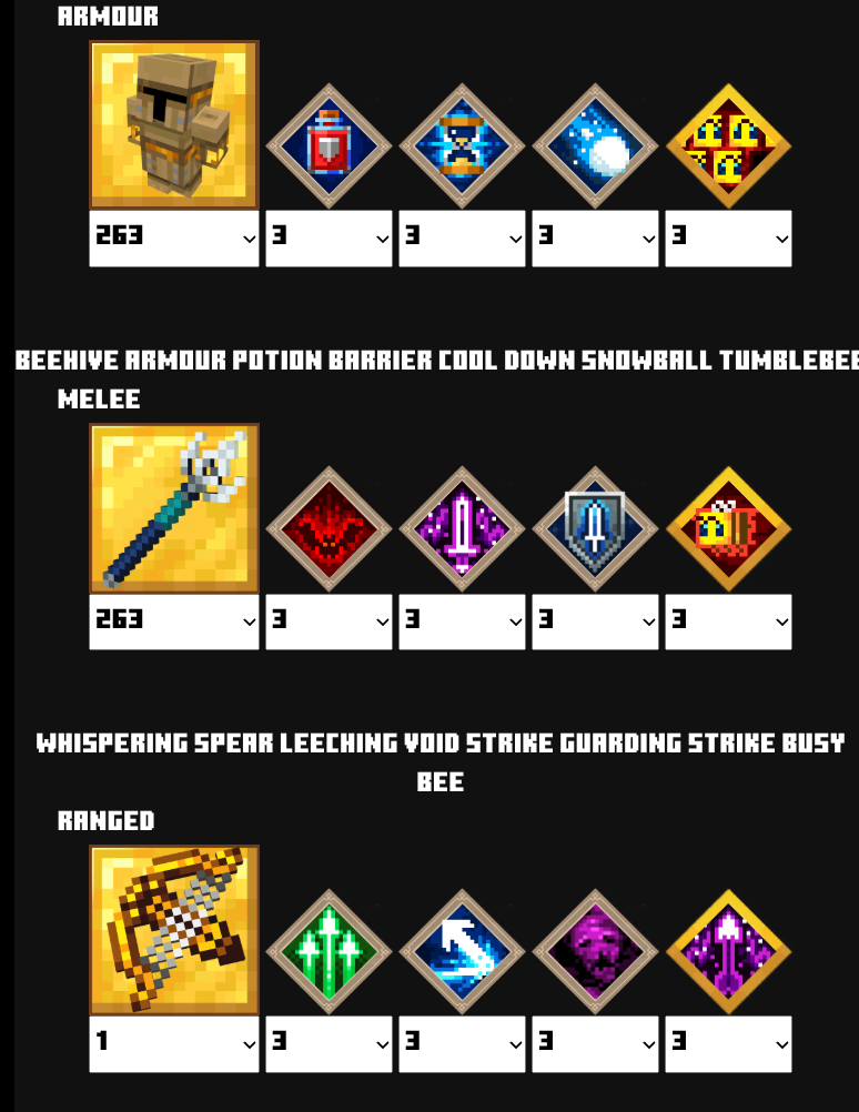 | 防具 | ビーハイブアーマー![]() | エンチャント | ポーションバリア![]() | クールダウン![]() | クールダウン![]() | ライフブースト![]() |