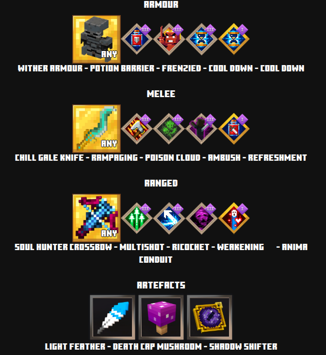 | 防具 | キツネのアーマー![]() | エンチャント | 幸運の海![]() | ポーションバリア![]() | 他のエンチャント(ただし無謀はなし) |