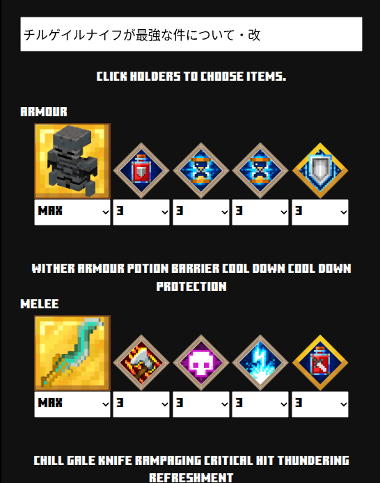 | 防具 | ウィザーのアーマー![]() | エンチャント | ポーションバリア![]() | クールダウン![]() | 臆病![]() | 無謀![]() |