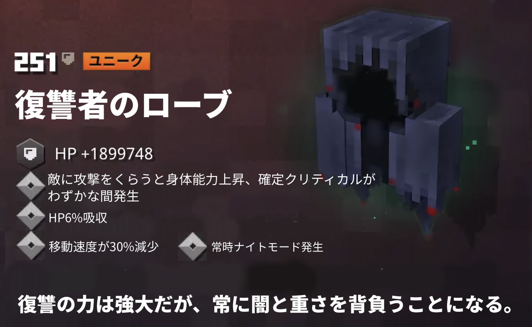 ただしこのローブを着ている間、移動速度低下と強制ナイトモードになる。