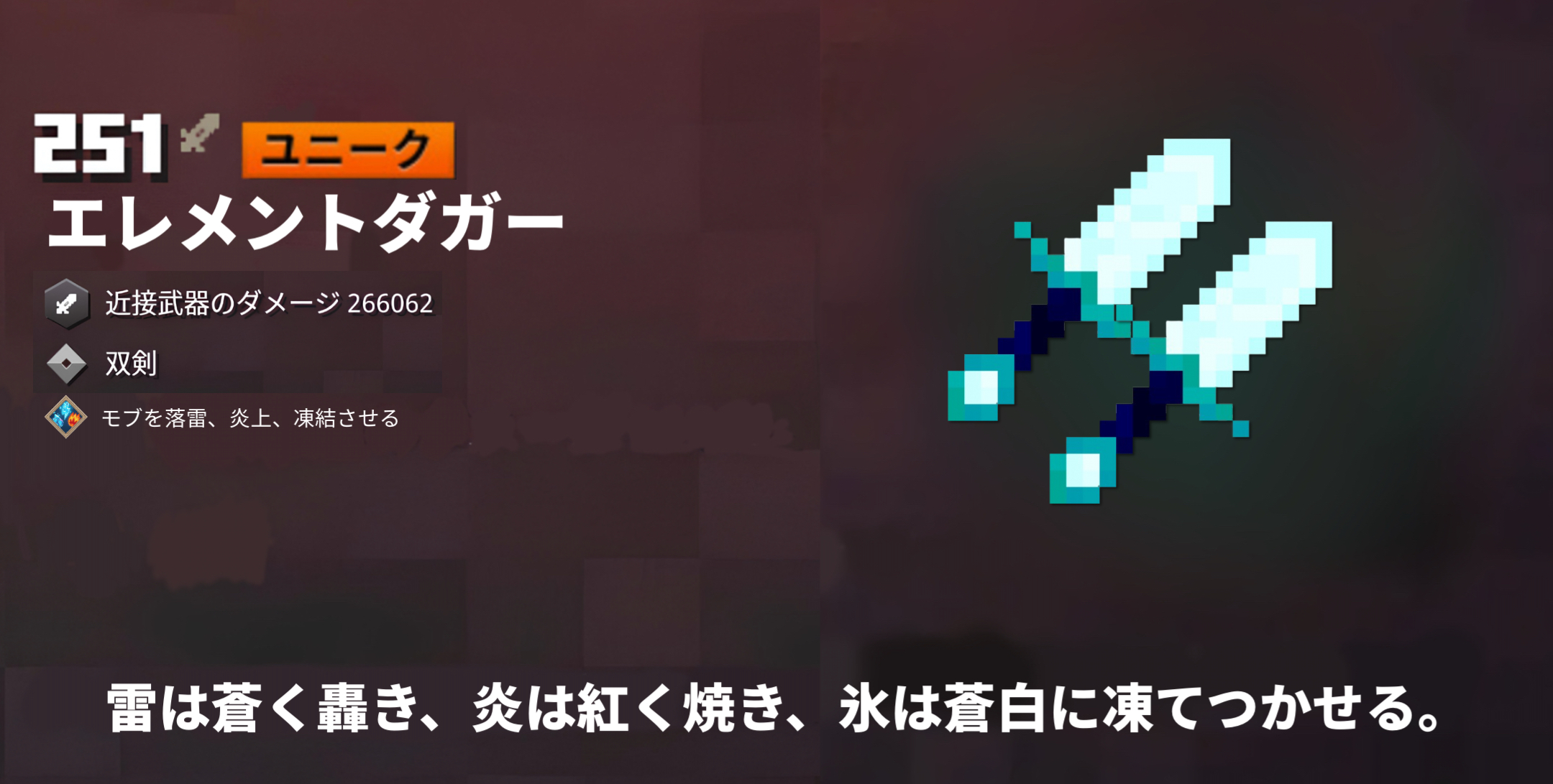 エレメントの力が加わったダガーで、雷を出す時は雷を纏うサファイア色に、火傷では炎を纏う赤色に、氷では冷気が出るアイスブルー色に、刀身が変わる。(超重要。相棒よ、覚えとけ)