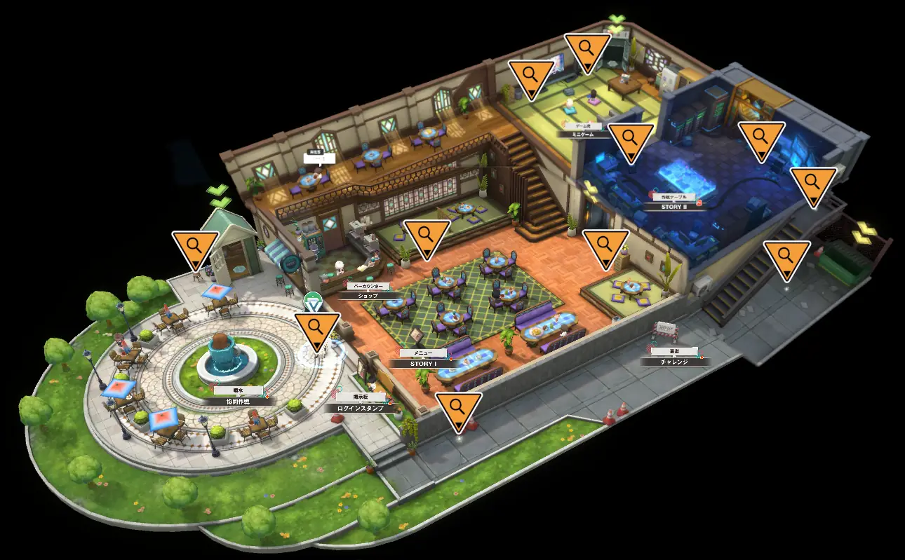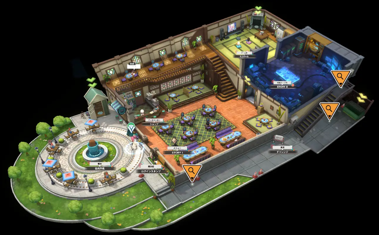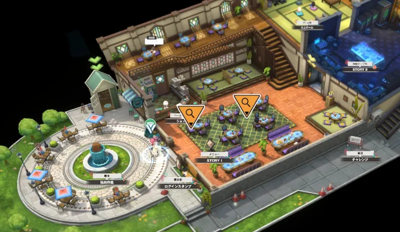 - 専用フィールドにNPCが配置されており、タップすることで各コンテンツをプレイできる