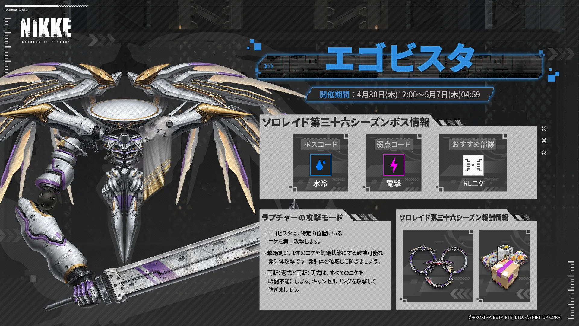 【乱光波】 エネルギーを放出し、 攻撃力が最も高いニケにダメージを与える 【地裂斬】 大地を切り裂く斬撃を放ち、 衝撃波と剣気が単一ニケにダメージを与える 効果:ニケ追加ダメージ 強力だがハイドおよび回避可能な攻撃 【擊絶剣】 翼剣を飛ばして単一ニケにダメージを与える 翼剣は迎撃できる 被弾したニケは一定時間、行動不能になる 効果:気絶状態、挑発およびヘイト無効 【飛剣波】 エネルギーを凝縮させて翼剣型の飛翔体を放ち、 単一ニケにダメージを与える 効果強力だがハイドおよび回避可能な攻撃 【破勢擊】 瞬時に接近して剣を振るい、 すべてのニケにダメージを与える 効果:ニケ追加ダメージ、 強力だがハイドおよび回避可能な攻撃 【斬影乱舞】 乱雑に振り回された剣から気を飛ばし、 すべてのニケにダメージを与える 効果:ニケ追加ダメージ、 強力だがハイドおよび回避可能な攻撃 【穿血擊】 貫く剣撃が単一ニケに遮蔽物を貫通するダメージを与える 被弾したニケは一定時間、持続ダメージを受ける 効果:攻撃力60%の持続ダメージ 【両断:壱式】 剣を納め、空間を両断する居合を放つ 特殊攻撃阻止を成功させる必要があり、 失敗した場合は部隊が全滅する 【両断:弐式】 剣を納め、空間を両断する居合を放つ キャンセルリングの発生中、 コードバリアを展開して攻撃を防ぐ コードバリアの展開中は電撃コードのニケに限りダメージを与えられる 阻止に失敗した場合、部隊が全滅する |