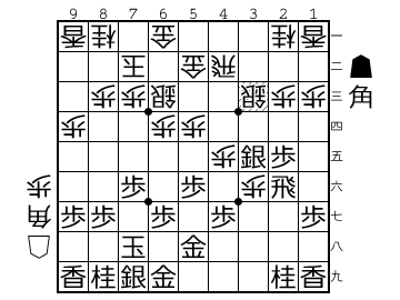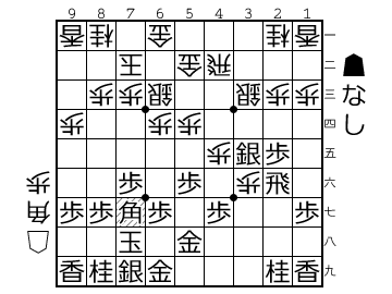 ▲7六歩△3四歩▲2六歩△4四歩▲4八銀△4二飛▲6八玉△9四歩▲7八玉△7二銀▲2五歩△3三角▲5六歩△5二金▲5七銀△3二銀▲5八金△6四歩(基本図)