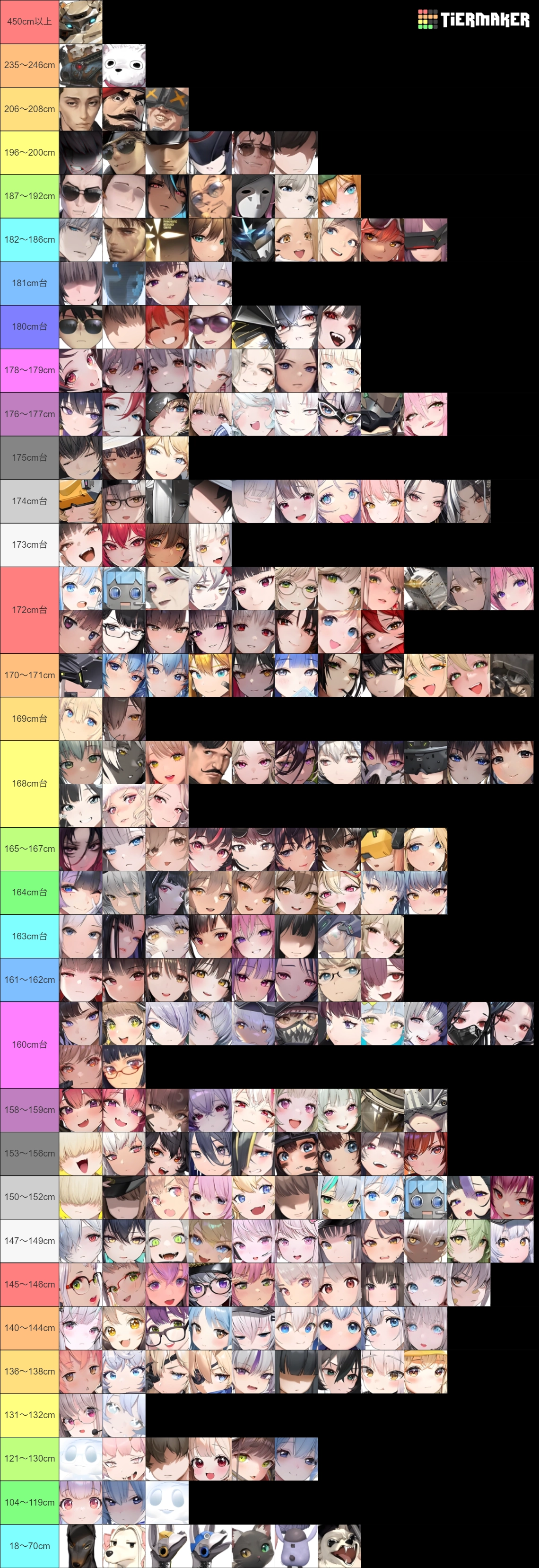 ※ニケ & 人間+実装状態に関係なく、数値的に高い方から50音順で並べました → 基本的に5cm刻みが目安なものの、1列分(11名以下)で収まらない場合はその人数分以下になるよう小分けし、よりわかりやすく調整しています。