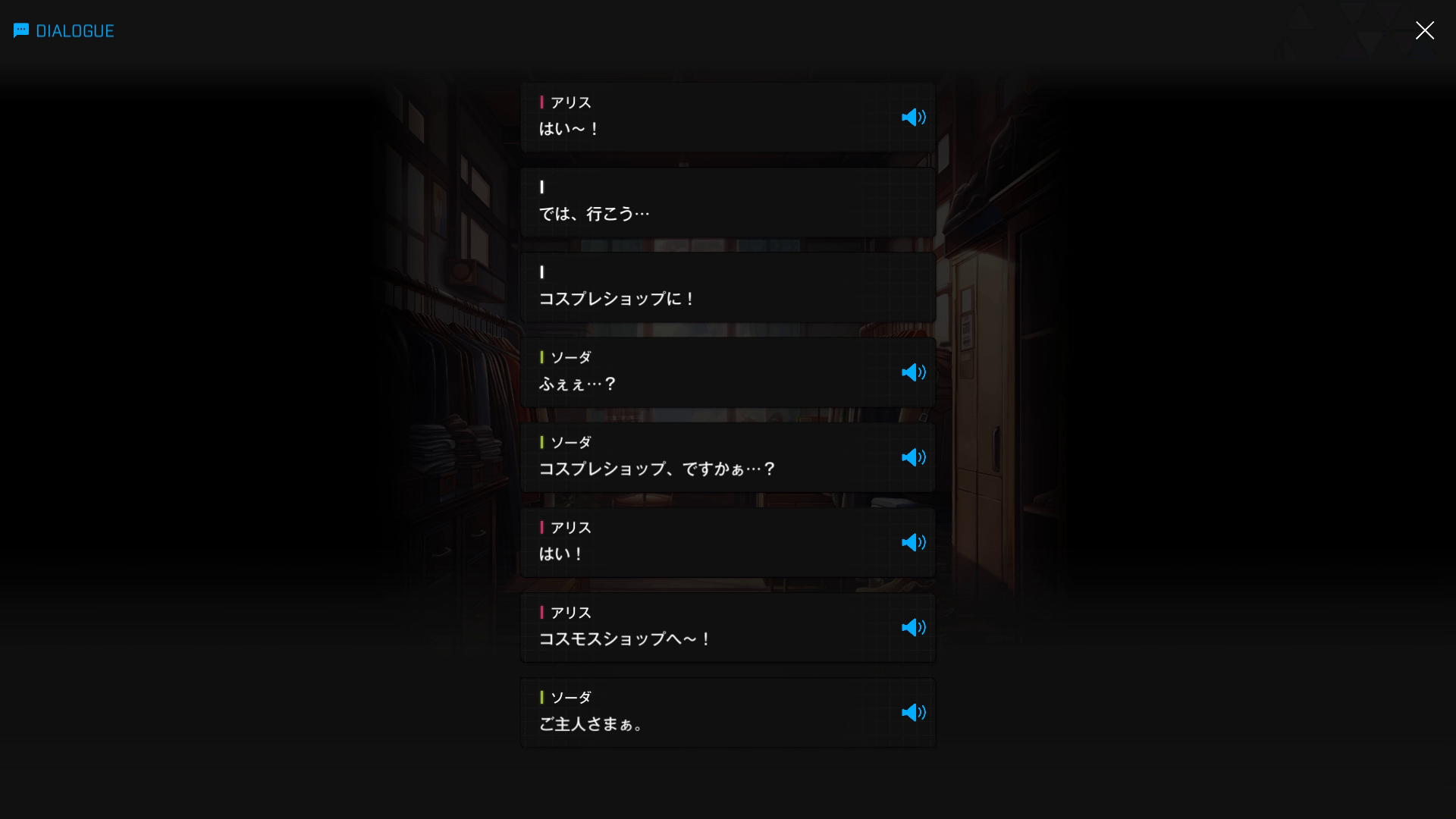 ・コスプレショップ:アリスWBが以下SSのように発言しているが、これは担当者による例の病気(誤字脱字)ではない → 彼女にとっては初めて聞く言葉だったのか、勝手にアリス語?に言い換えているだけで、実際の流れは2枚目のとおり(アリスWBエピソード3 & イベント『Golden Coin Rush』第1部『参加の申し込み:B』より)