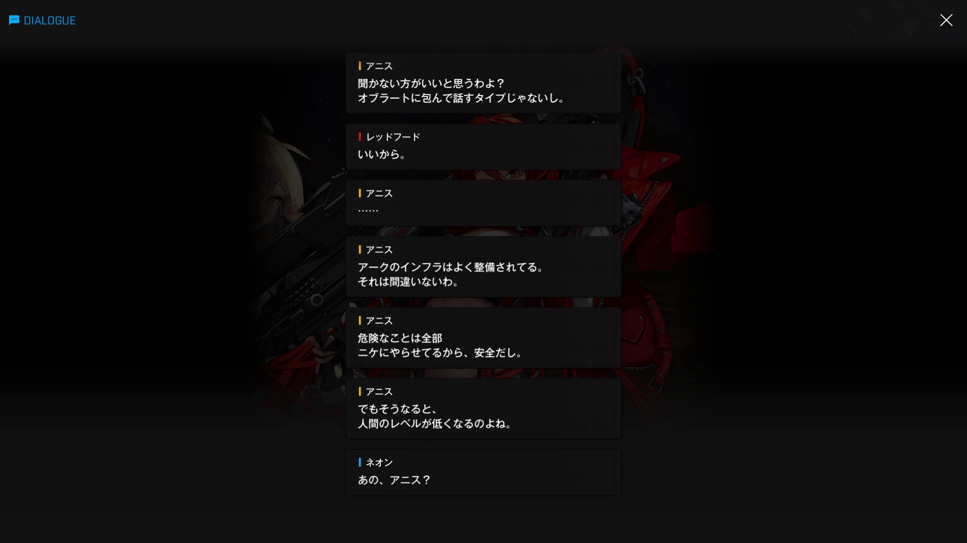 ・人間の価値観は、生まれ育った環境 & 自分を取り巻く相手などにより千差万別だが、それはニケでも同様である → ネオン & アニスはもちろん、他ニケのエピソードなどを見ても、アークに対する考え方は大きく食い違う