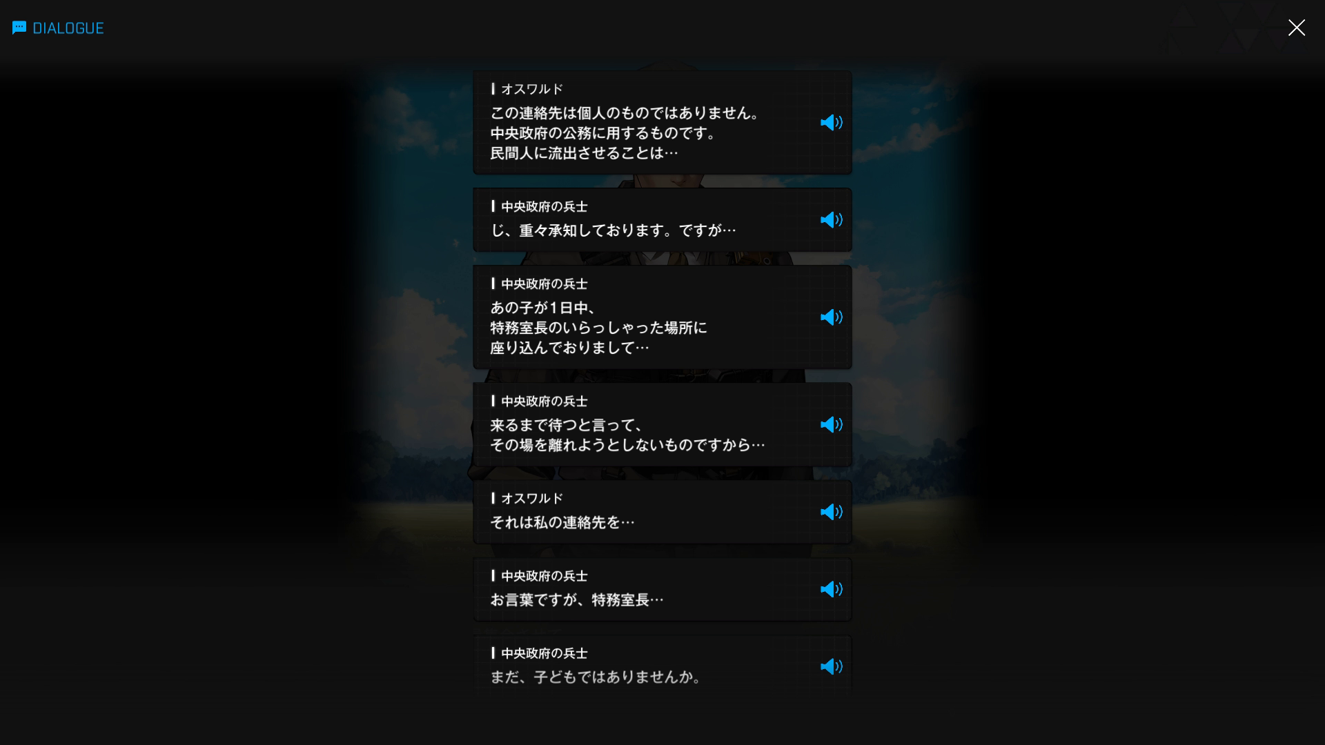 ・養女のフリージアとアーク行きのエレベーターに乗ったあと、おそらく彼の執務室で、以下SSのような『反吐が出るほど胸糞悪い』内容を確認している → 管理人が文面を読んでいるだけでも、いかに中央政府 = V.T.C.が自分勝手 & 腐りきっているかがよくわかるため、彼の苦痛 & 心情を推し量ることなど到底できない(第2部『アークガーディアン:B』より)
