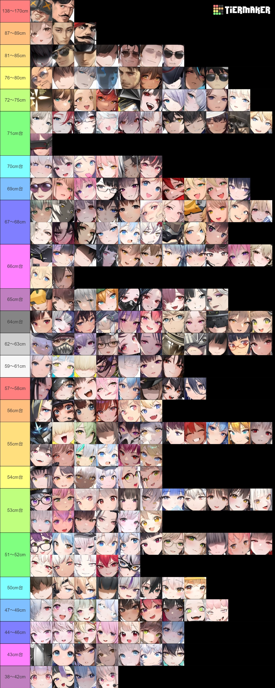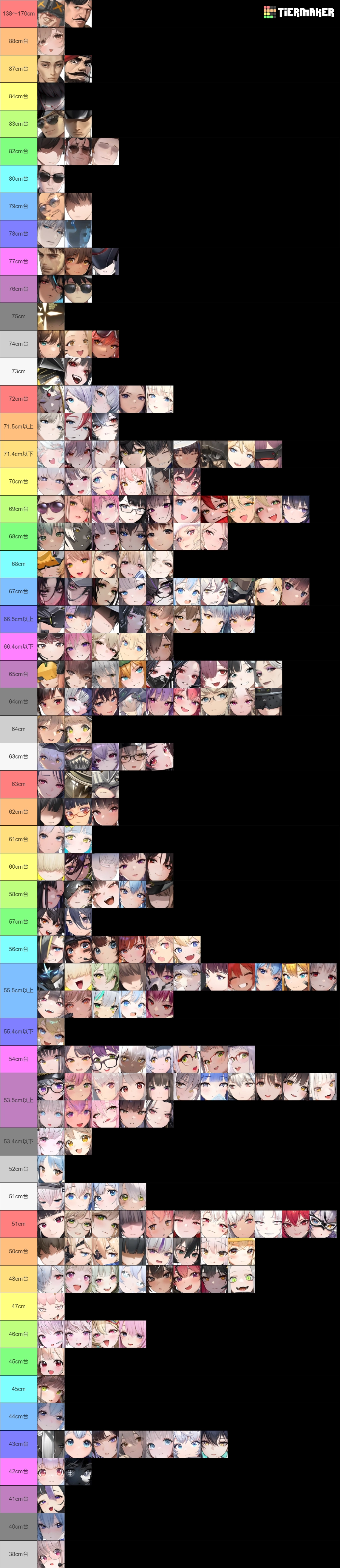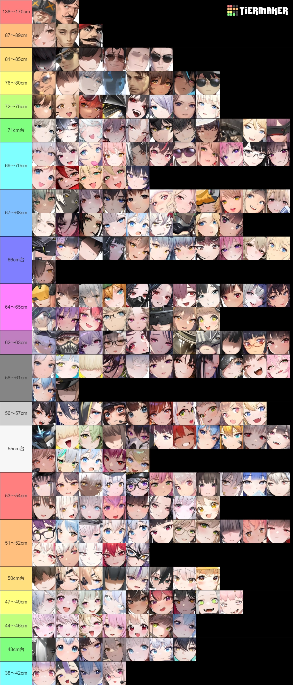 ※ニケ & 人間+実装状態に関係なく、数値的に高い方から50音順で並べました → 基本的に2~3cm刻みが目安なものの、1列分(11名以下)で収まらない場合はその人数分以下になるよう小分けし、よりわかりやすく調整しています。