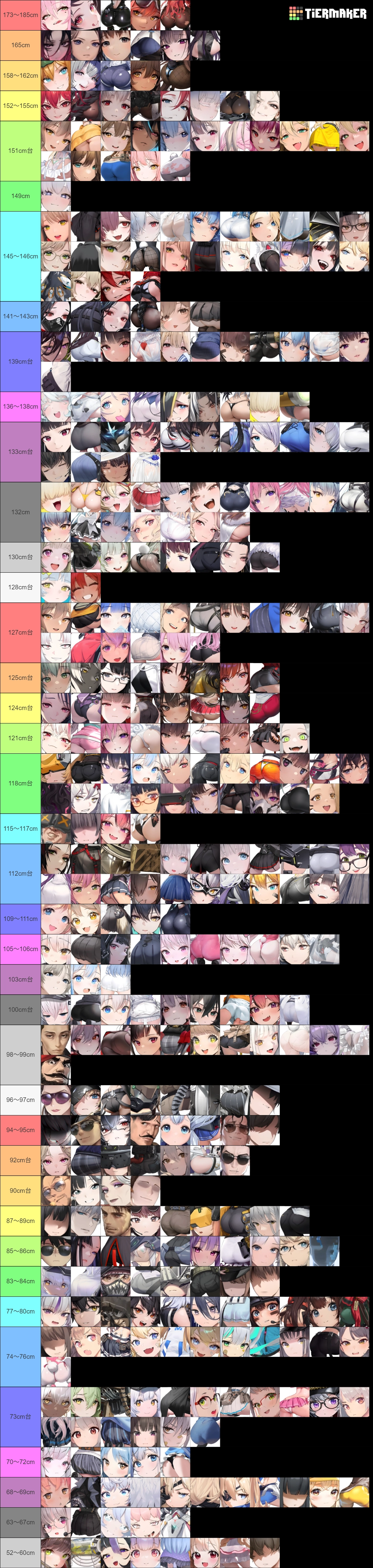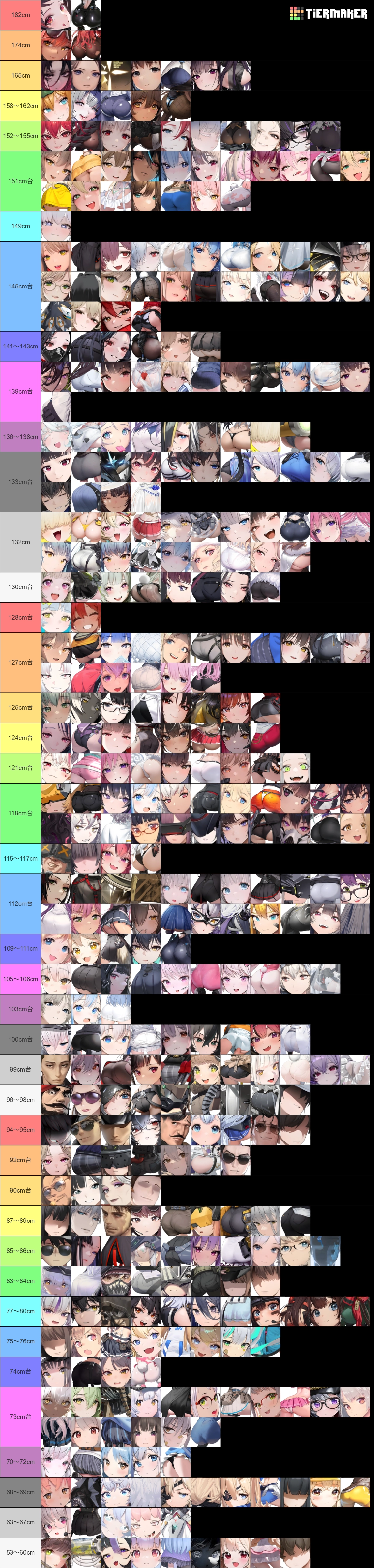 ※ニケ & 人間+実装状態に関係なく、数値的に高い方から50音順で並べました → 基本的に2~3cm刻みが目安なものの、1列分(11名以下)で収まらない場合はその人数分以下になるよう小分けし、よりわかりやすく調整しています。