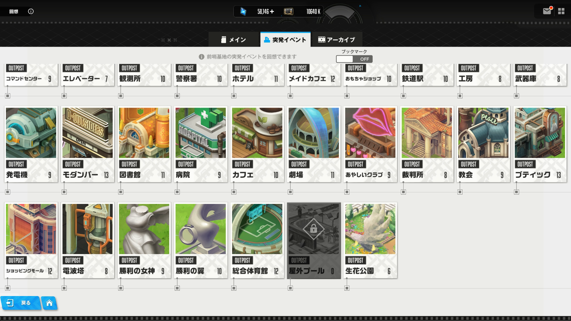 A10:40回(観測所で5回、裁判所で3回、勝利の女神で2回、総合体育館で5回、発電機で16回、モダンバーで9回)