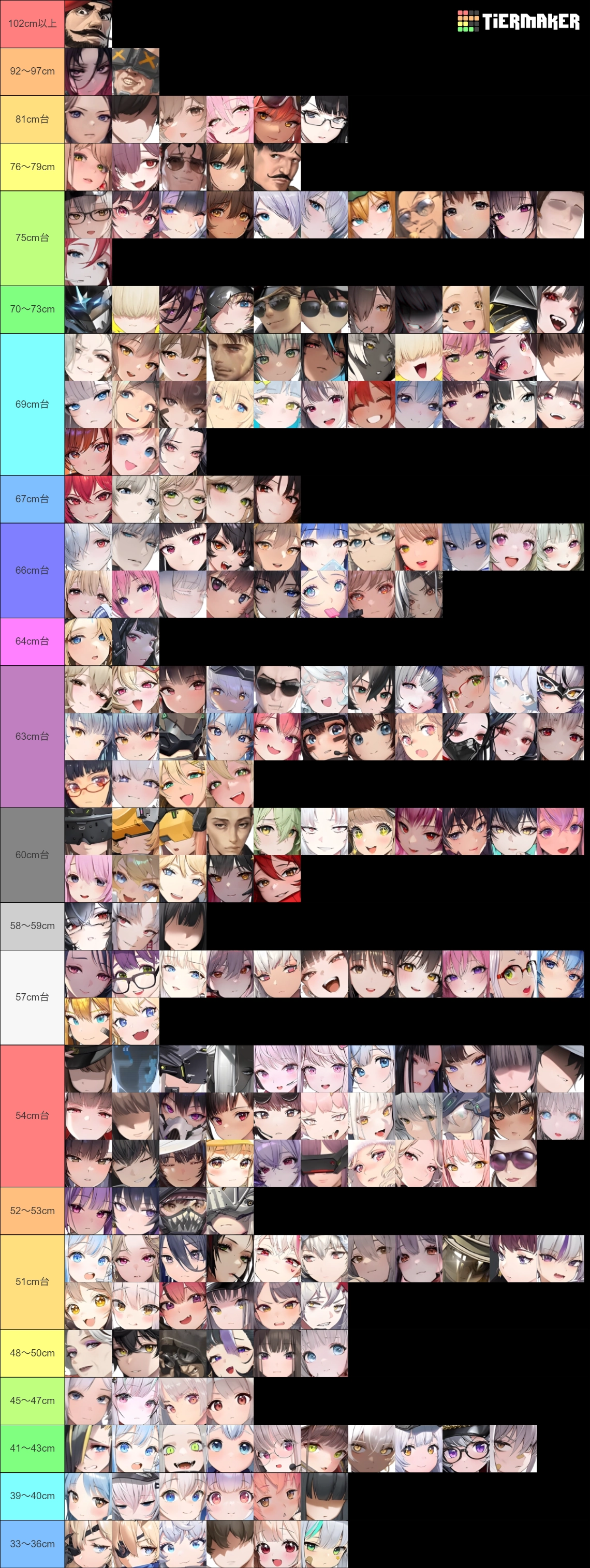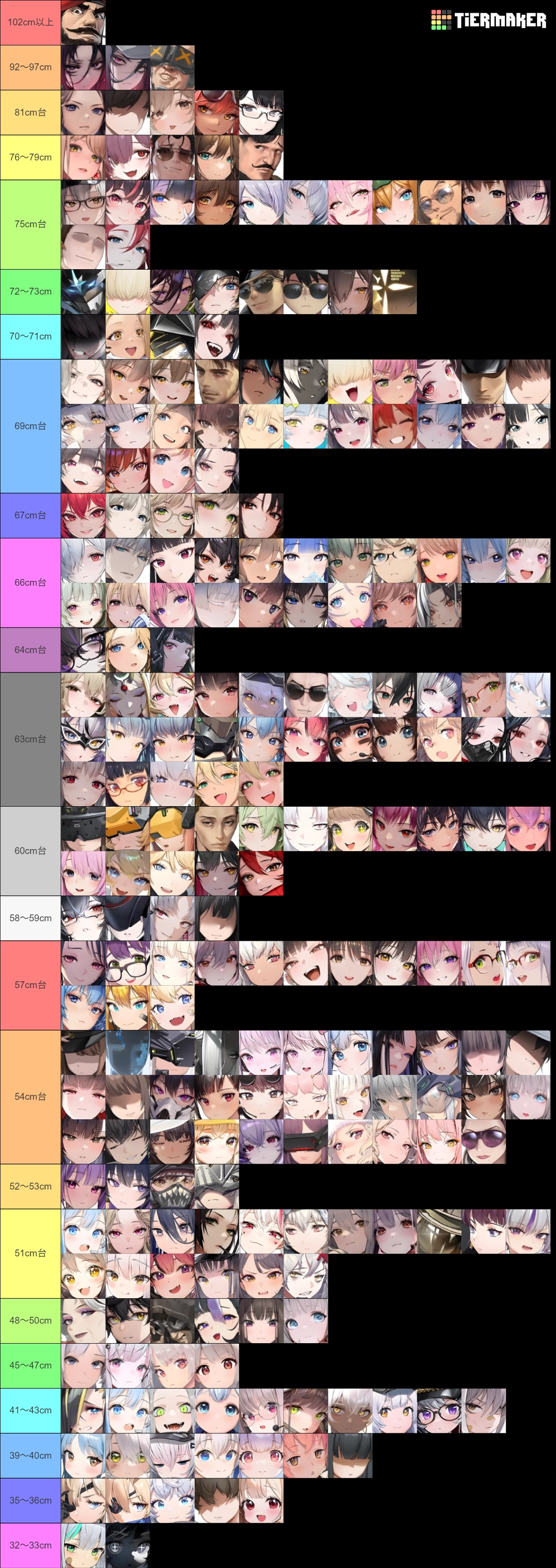 ※ニケ & 人間+実装状態に関係なく、数値的に高い方から50音順で並べました → 基本的に2~3cm刻みが目安なものの、1列分(11名以下)で収まらない場合はその人数分以下になるよう小分けし、よりわかりやすく調整しています。