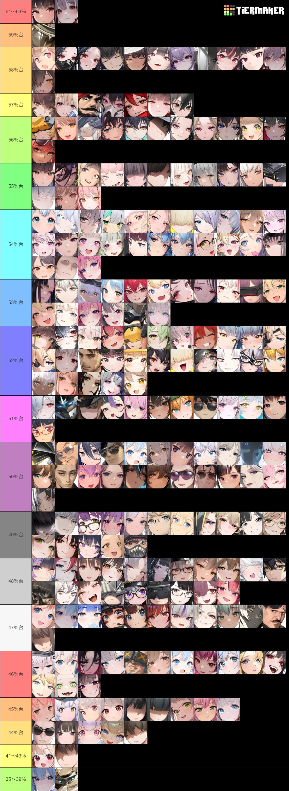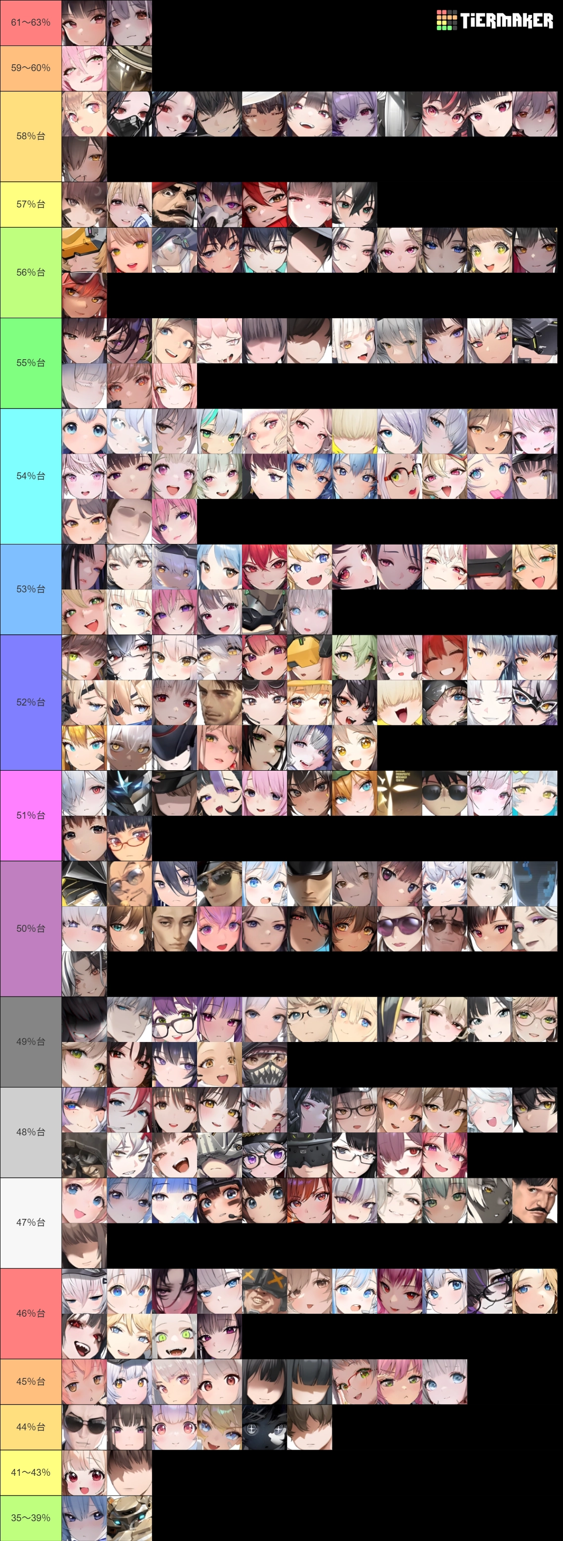 ※ニケ & 人間+実装状態に関係なく、数値的に高い方から50音順で並べました → 基本的に2~3%刻みが目安なものの、1列分(11名以下)で収まらない場合はその人数分以下になるよう小分けし、よりわかりやすく調整しています。
