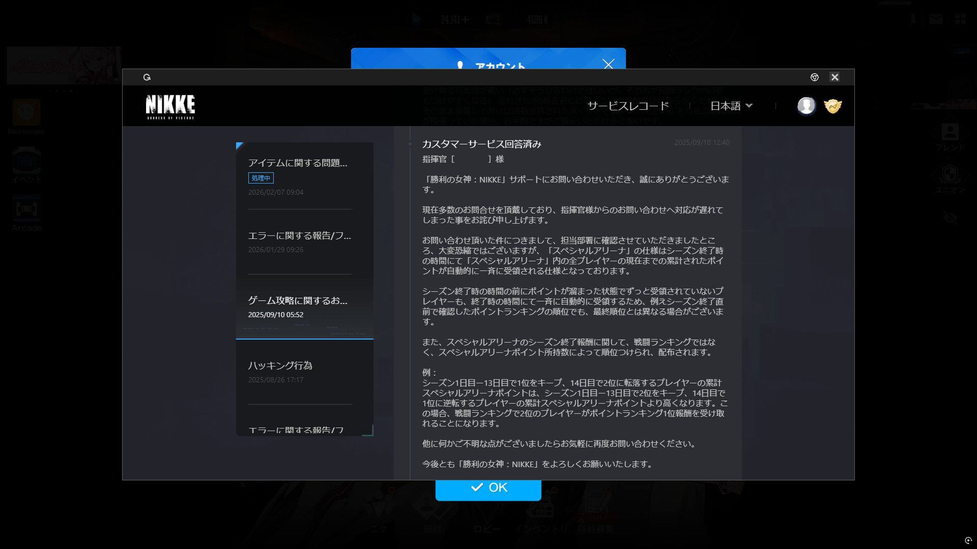 さらに追加で「アリーナの報酬につきましては、毎日5時のリセット時点における最終順位を基準に自動的に集計・配布されます。そのため、リセット直前にログインいただく必要はなく、未受領のポイントについても自動的に反映されます」とも書かれていました → 極端な話、『2週間ずっと特定の順位(例えば3位)を維持 & 全く報酬を受け取らなかったとしても、誰かに1回攻撃を仕掛けさえすれば、シーズン終了時に3位の報酬 = 24Hr × 14日分が丸々メールで送られてくる(前哨基地防衛報酬で、24時間を過ぎた超過分蓄積のような制限は一切かからない)』わけです。