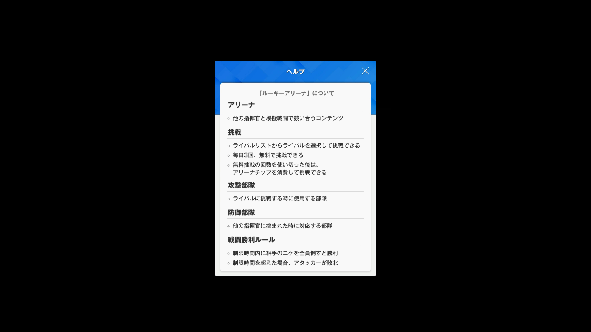 ●スペシャルアリーナ:3ラウンド制で、他の指揮官たちと模擬戦闘を行い、強さを競うコンテンツ