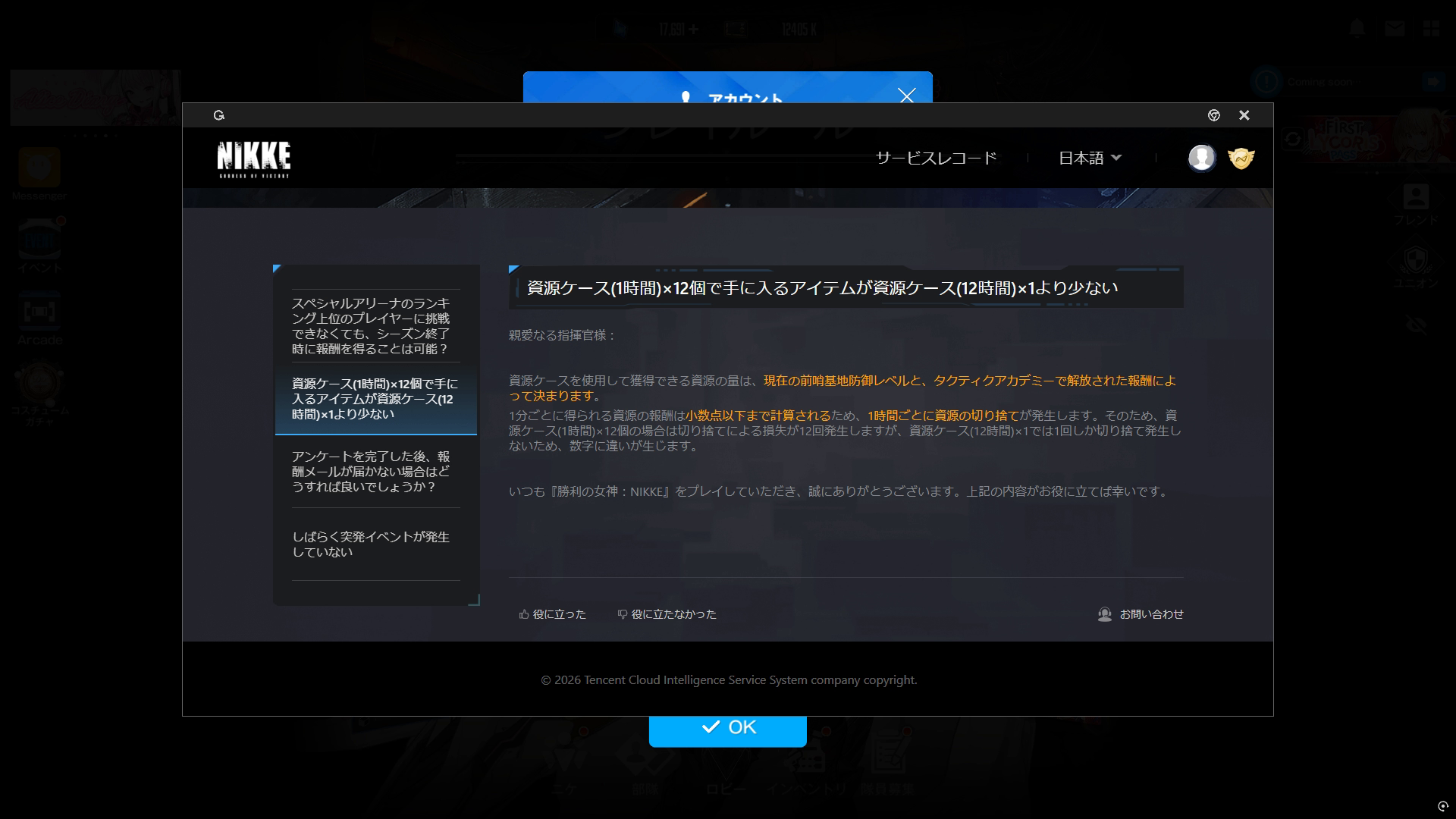 ③ニケレベルポイント:文面のとおりで、Lv1なら+1、Lv100なら+100 → ③の場合、①のように特定ランクのニケ限定ではなく、たとえRランクの量産型であってもプラスされる