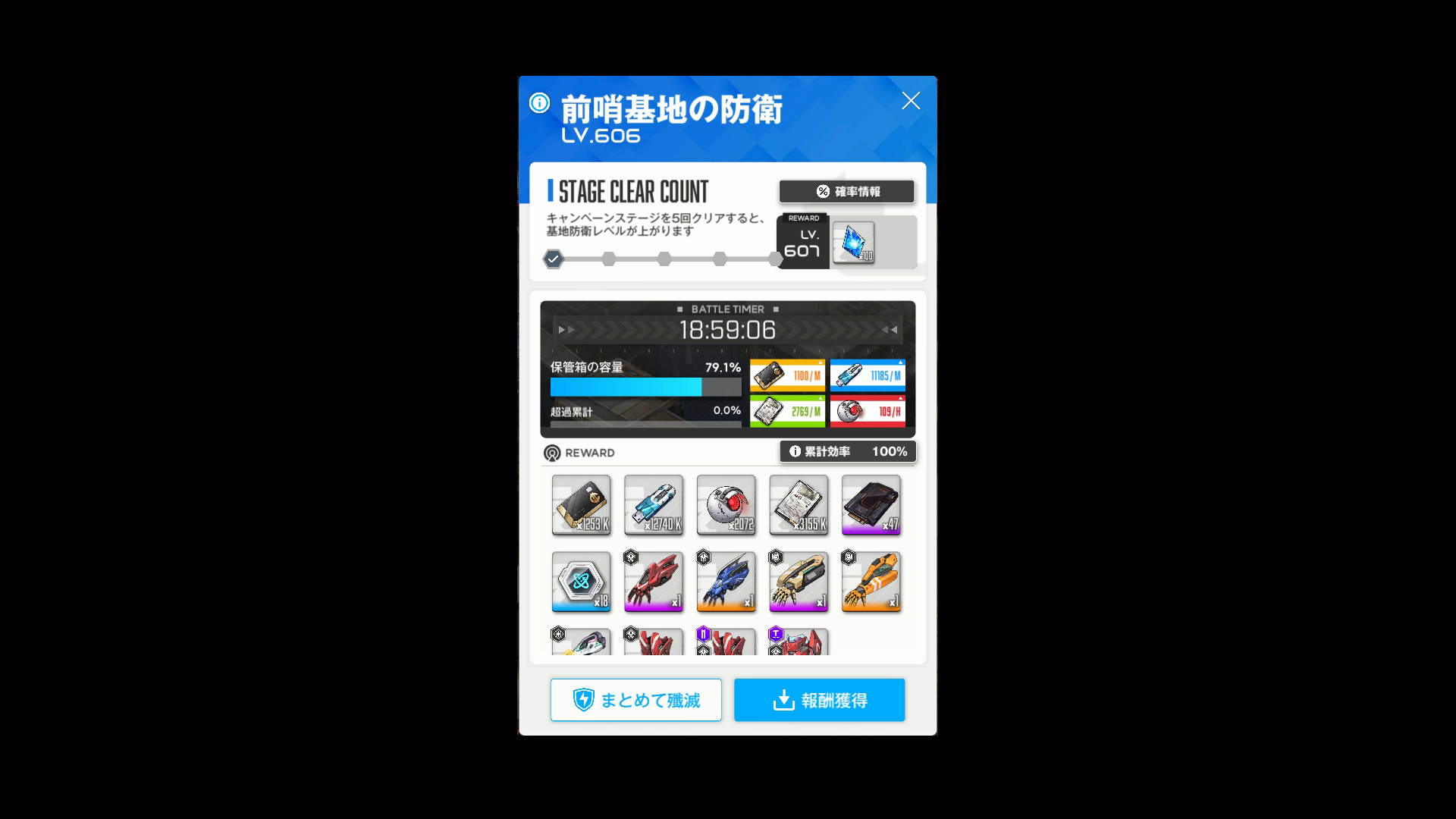 ・簡単に例を挙げて説明すると、以下SSのとおり、『報酬受け取りから18時間59分後に画面を開いた』状態で、『1段目右端のモジュールハイブースト & 2~3段目の装備品以外』の入手数をよく確認して欲しい