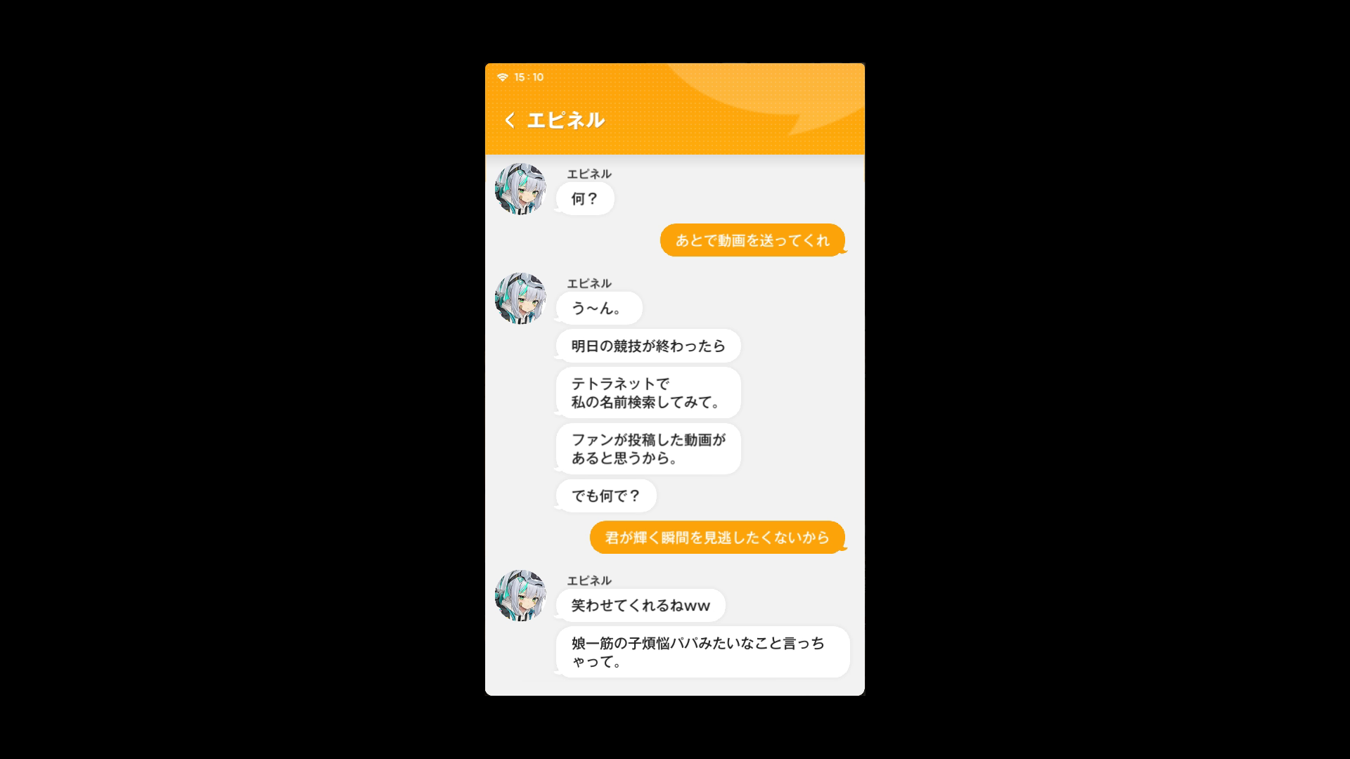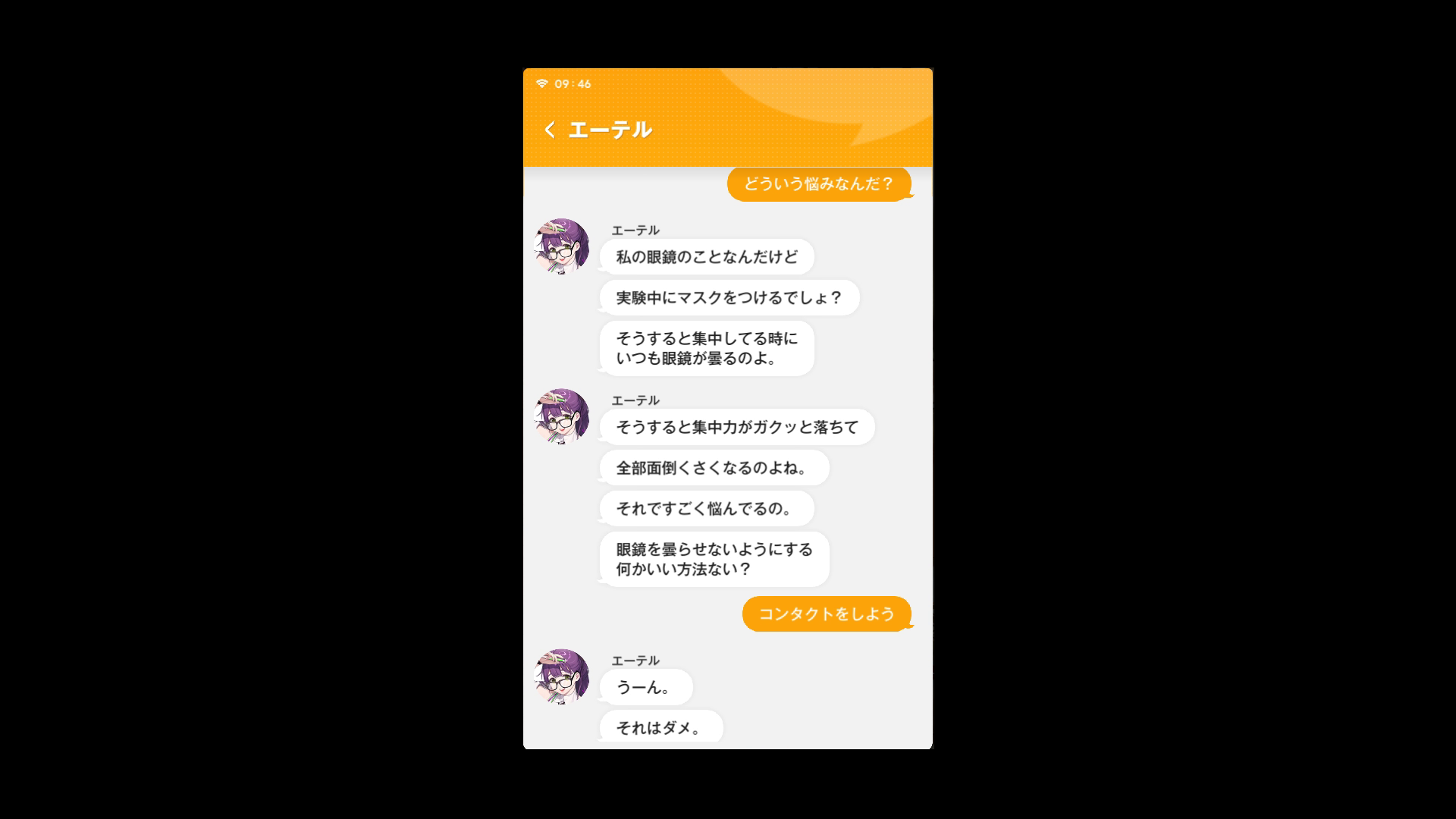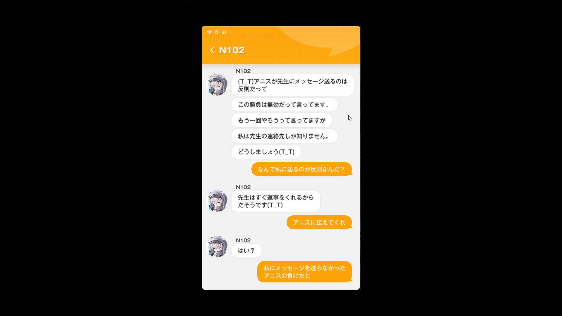 ・主人公の連絡先しか知らない彼女に対し、メッセージ返信ゲームで勝負するアニスもどうかと思うが、彼の機転で見事勝利を収める → ちなみに、これ以外のblabla内容は、全て彼女のエピソードの後日談に関するもの(N102 blablaより)