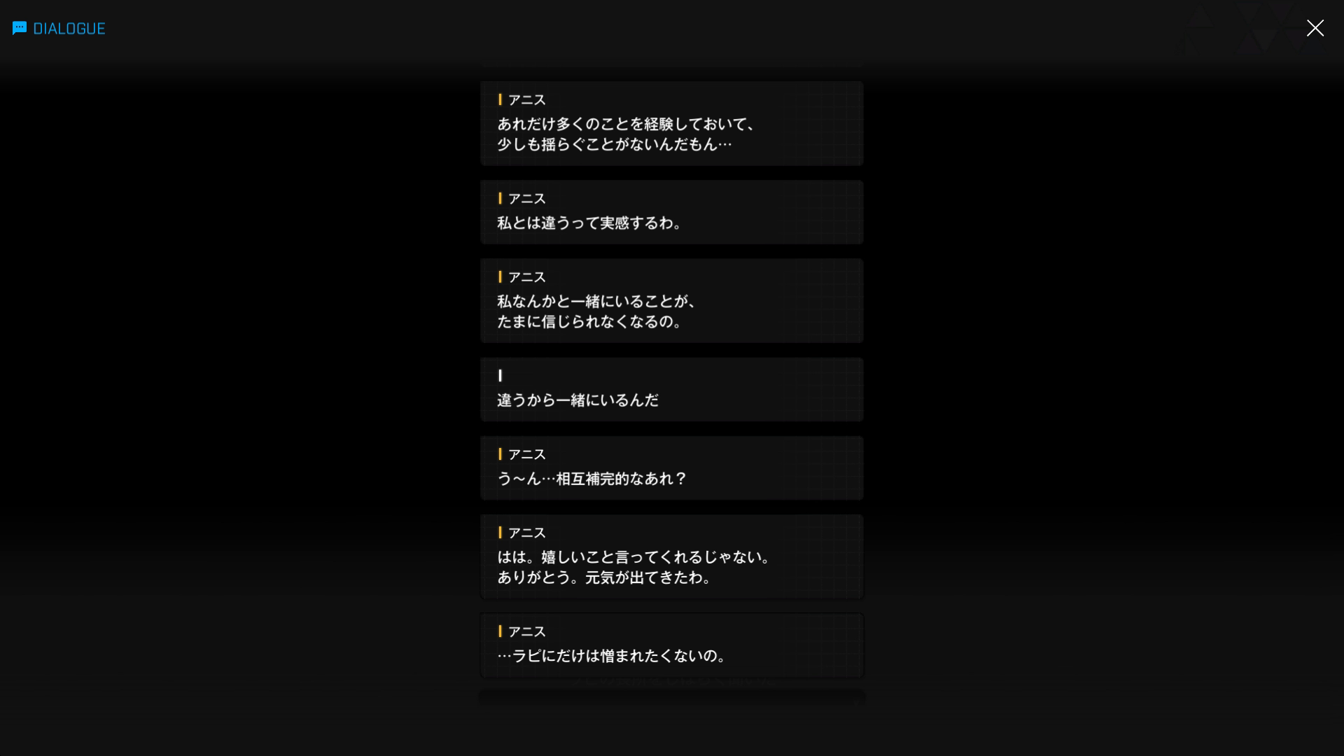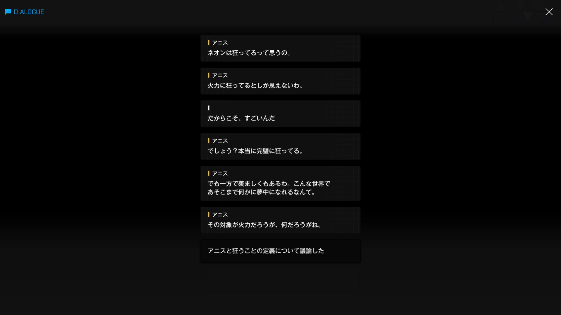 ・「戦っているとなぜか楽しくなる時がある」らしい → いわゆる『〇〇ハイ』という類の現象と思われるが、これまで例え相手がニケ歴の長いリター & ピルグリムのスノホワであっても、大喧嘩 & 殴り飛ばすような狂犬ぶりを何度も披露しているため、好戦的ではないと『完全に』否定はできない(アニス面談:16より)