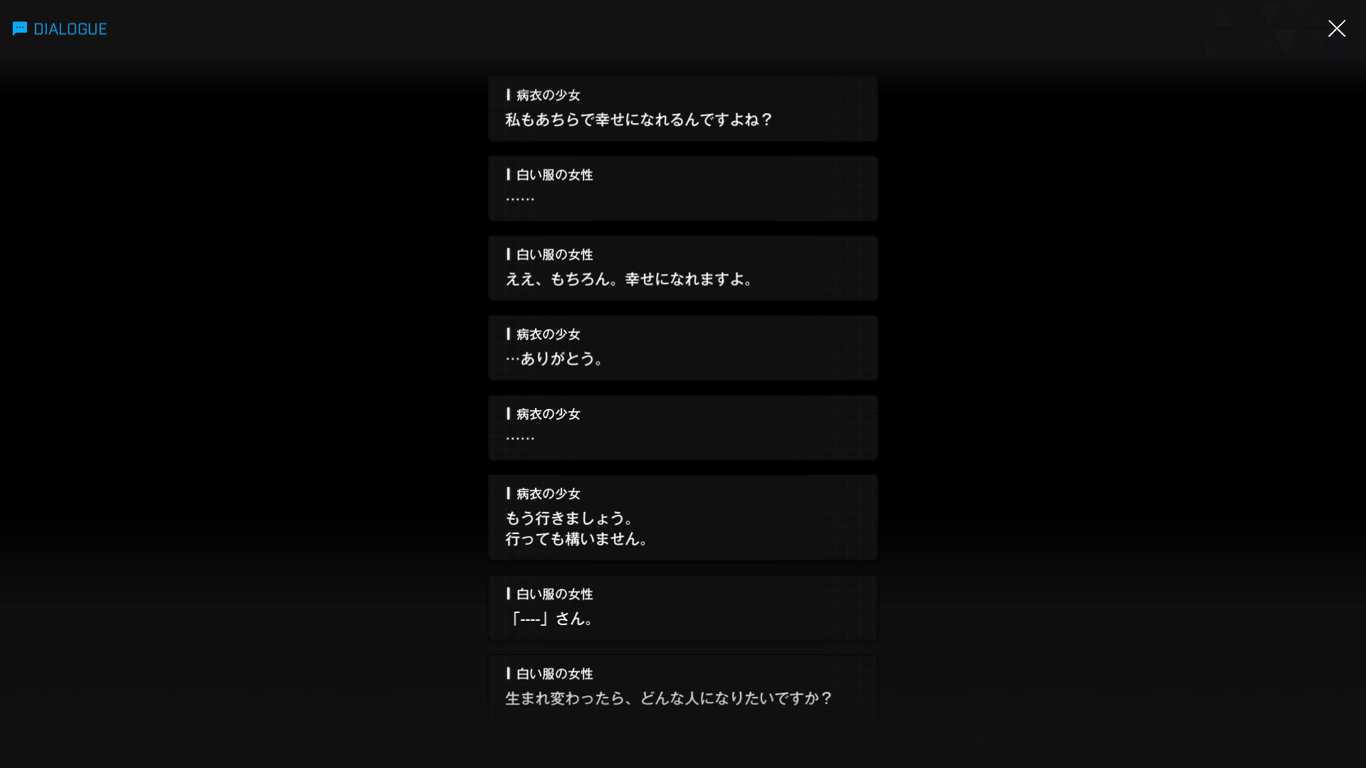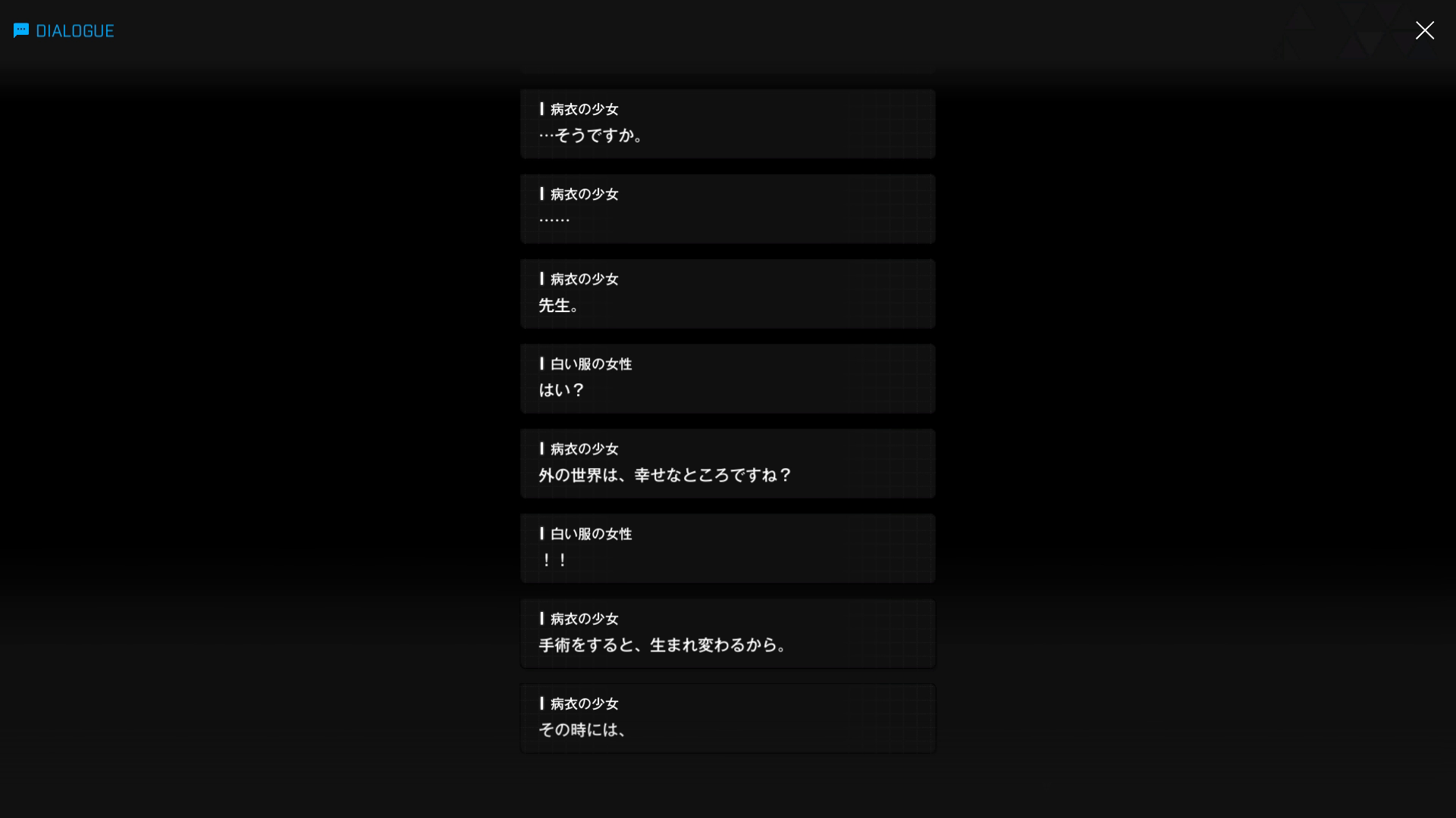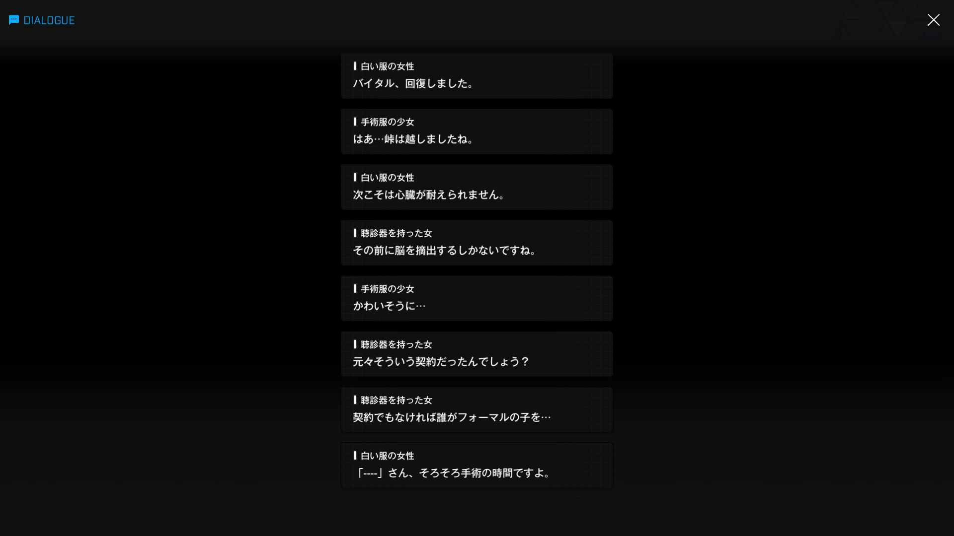 ⑤1枚目の『契約』については、おそらく『一般の病院ではアリスの病気を治療できないため、本来であれば高額の入院 & 手術費などがかかるはずの専門病院に、両親などの血縁者が「完治の見込みがない場合、彼女の脳の摘出をしてでも命を救ってほしい = ニケ化に同意する」という契約書を交わしていたのだろう → だからこそ、聴診器の女が「事前に契約を結んでいるから、仕方なくフォーマルの子でも面倒見てやっている」という意味の発言をしたはず
