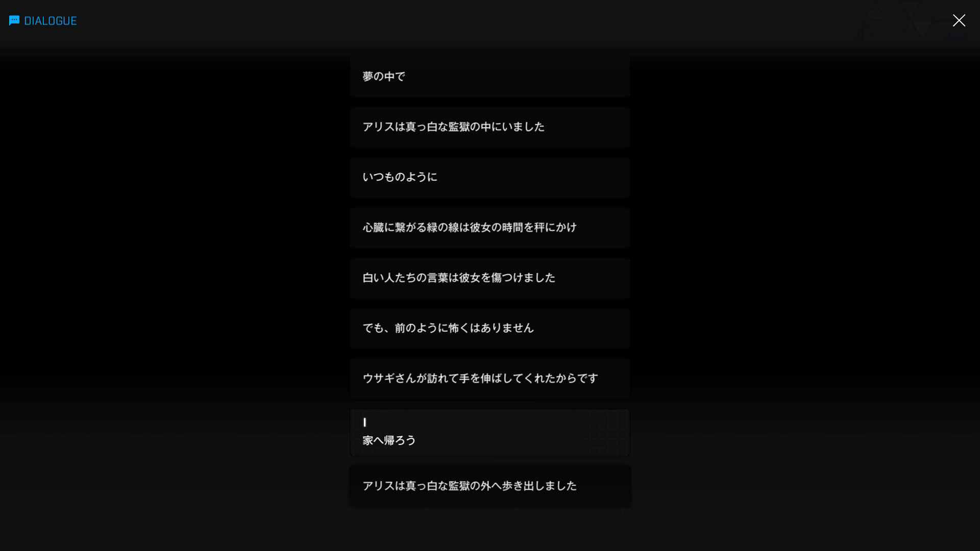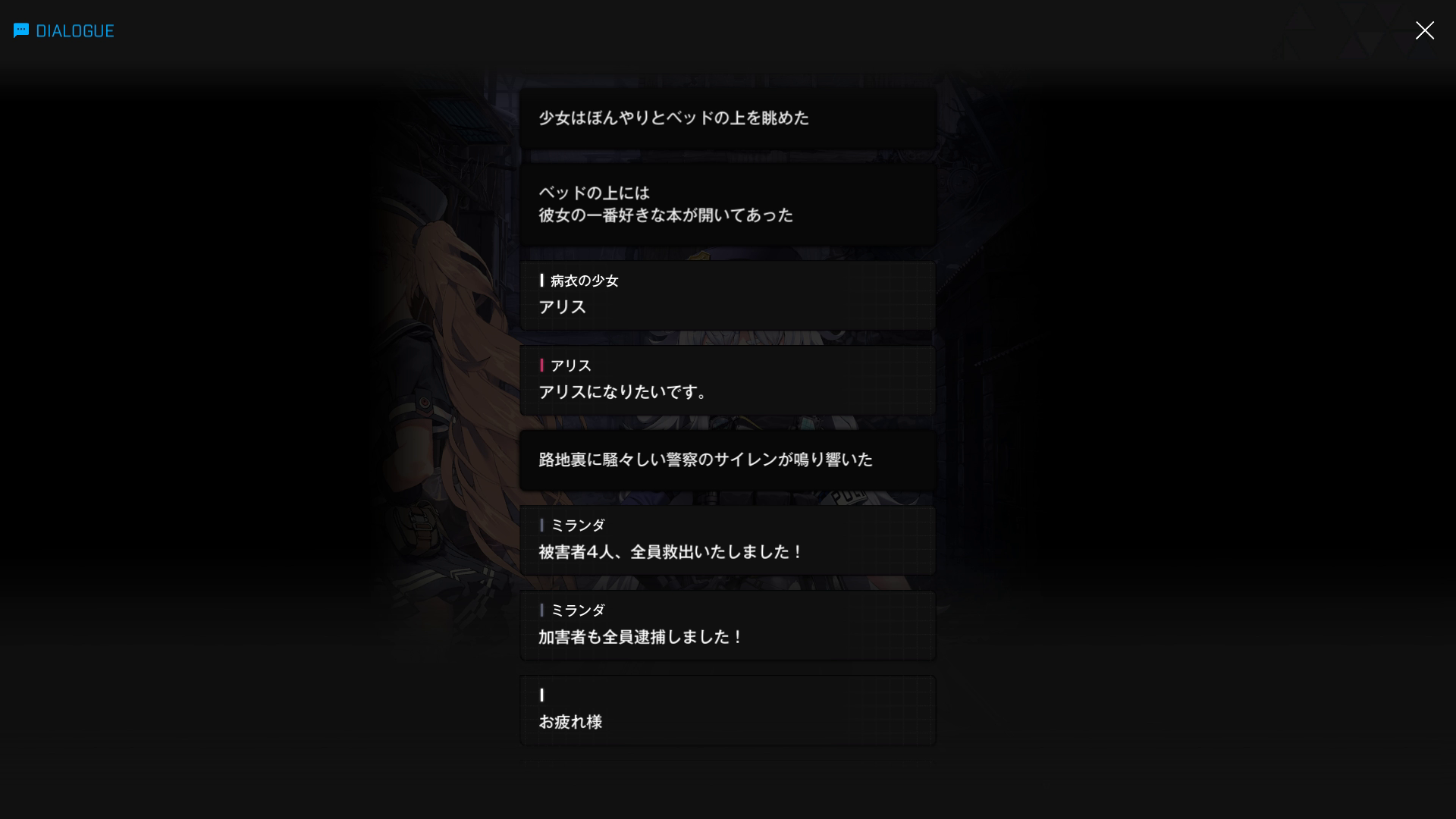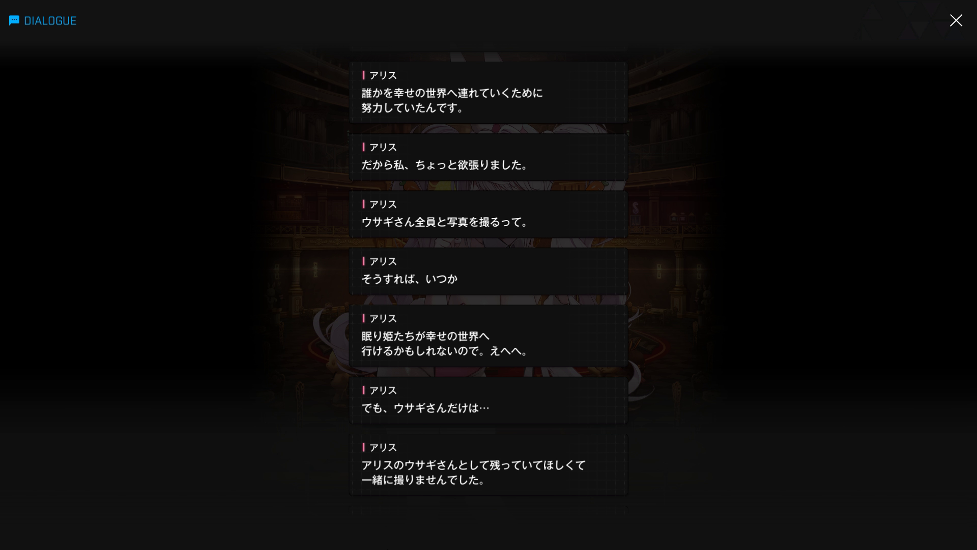 ④なぜ病衣の少女がアリスを希望したかについては、ニケ化したアリス自ら「本の中の世界は幸せでいっぱいだから」&「昔は不思議な国のアリスの本を毎日読んでいて、この本が好きすぎて読むだけで幸せだった」と語っているため(アリスエピソード2より)