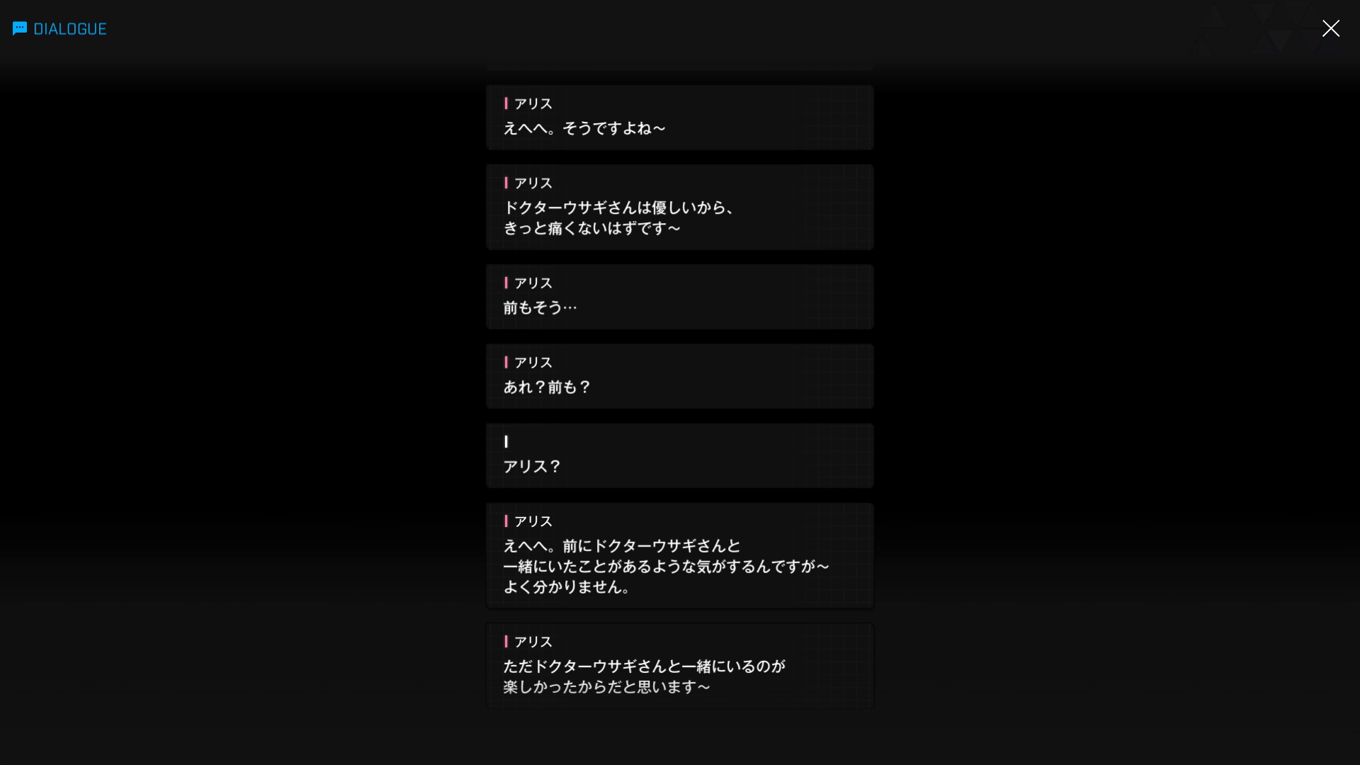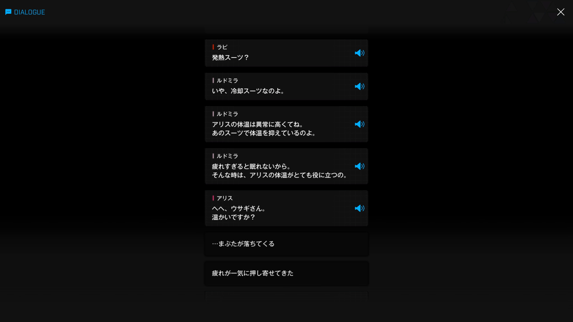 ●アンリミテッドのメンバー & 敵など:主人公を「ウサギさん」、ルドミラを「雪の女王様」、ネヴェを「ホッキョクグマさん」、トーブを「ヒヨコさん」、迷子のニケ達を「眠り姫」、メカ全般を「機械の方たち」、クイーンを「ハートの女王」、ラプチャーを「ハートの女王の家来 or 手下たち」(CHAPTER.06 & アリス面談など)