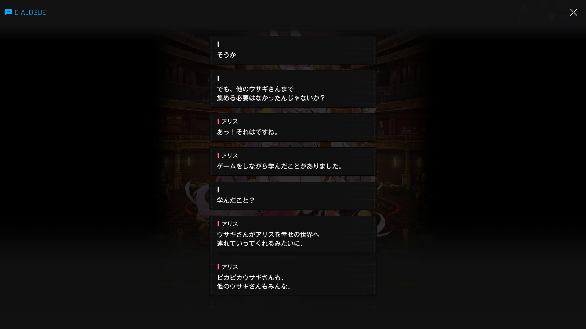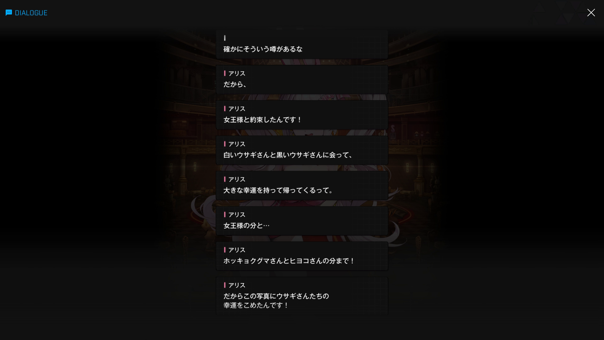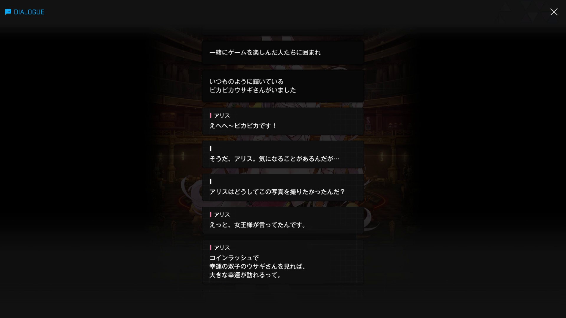 ●イベント『Golden Coin Rush』関連:ソーダを「ピカピカさん」、ソーダTBを「ピカピカウサギさん」、ノワールを「黒いウサギさん」、フォルクヴァンを「ツルツルウサギさん」、ブランを「白いウサギさん」、メアリーを「ドクターウサギさん」、ルピーを「金のウサギさん」、ヤンを「赤い扇子の方」(アリス面談など)