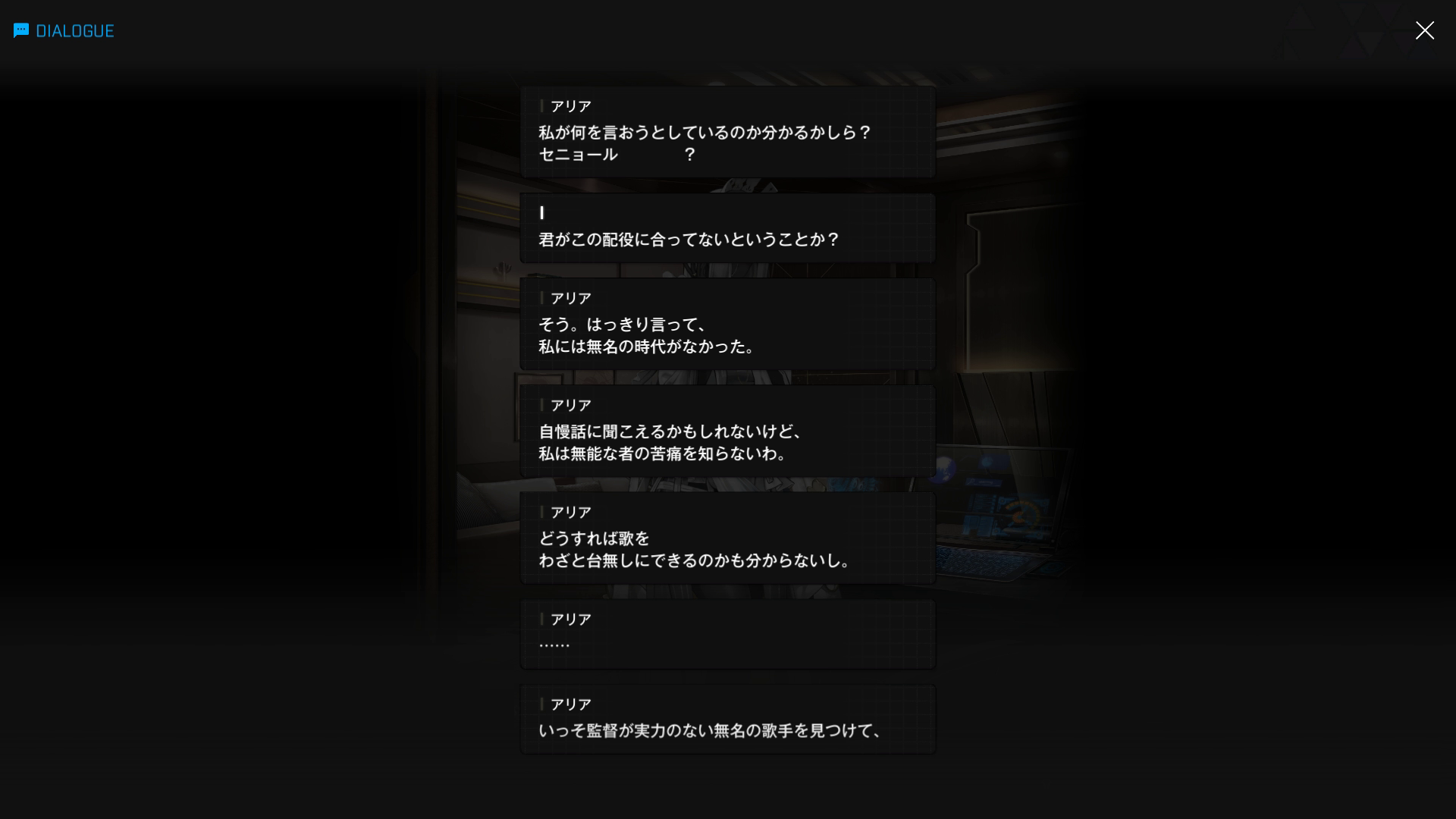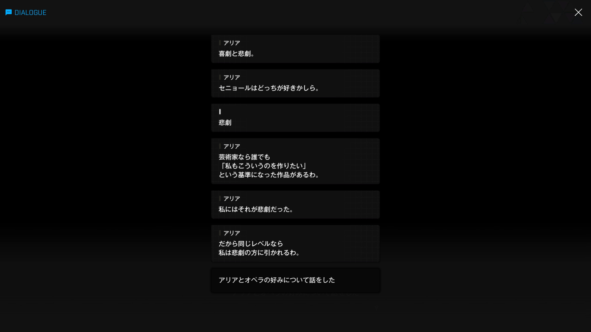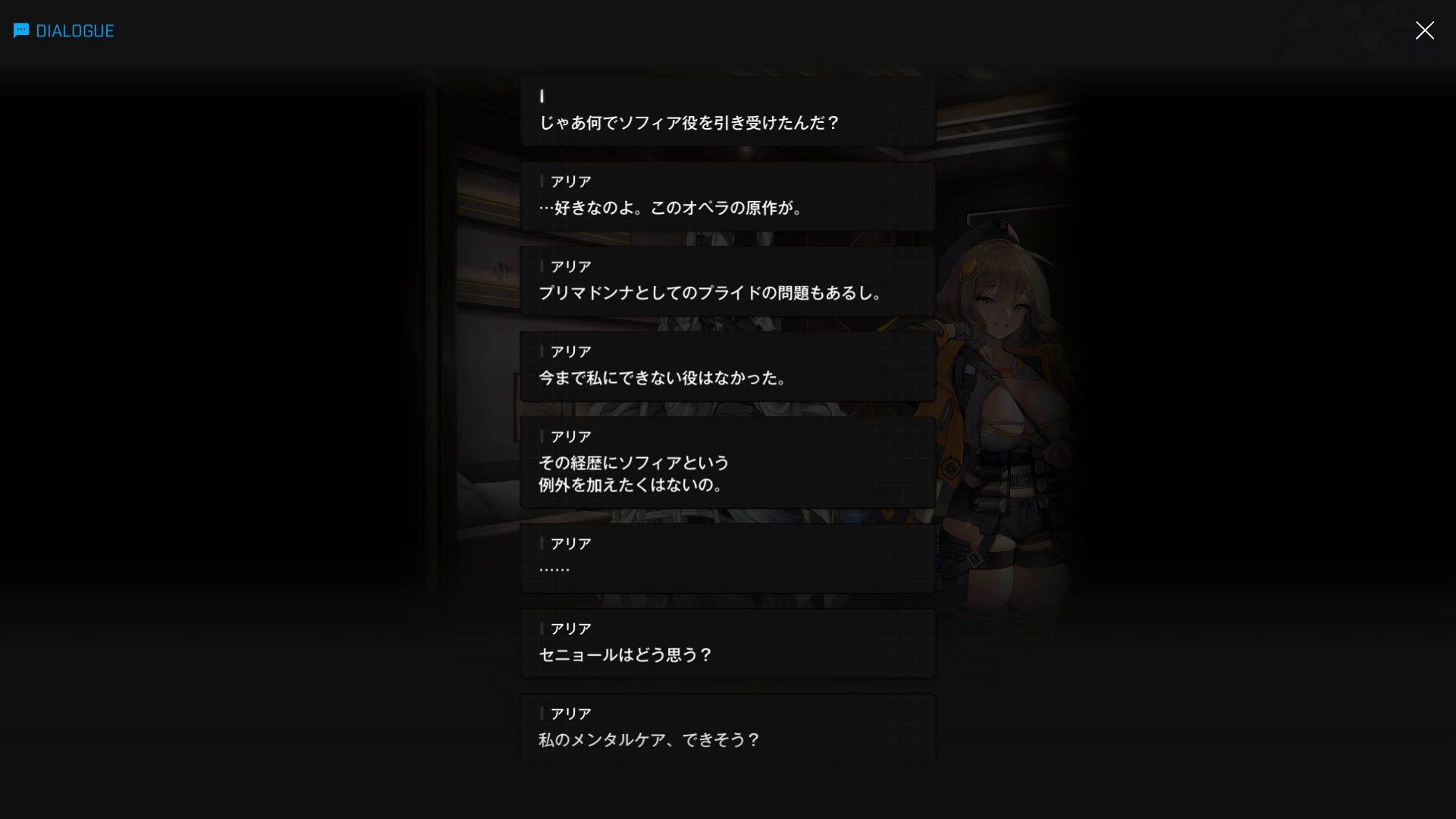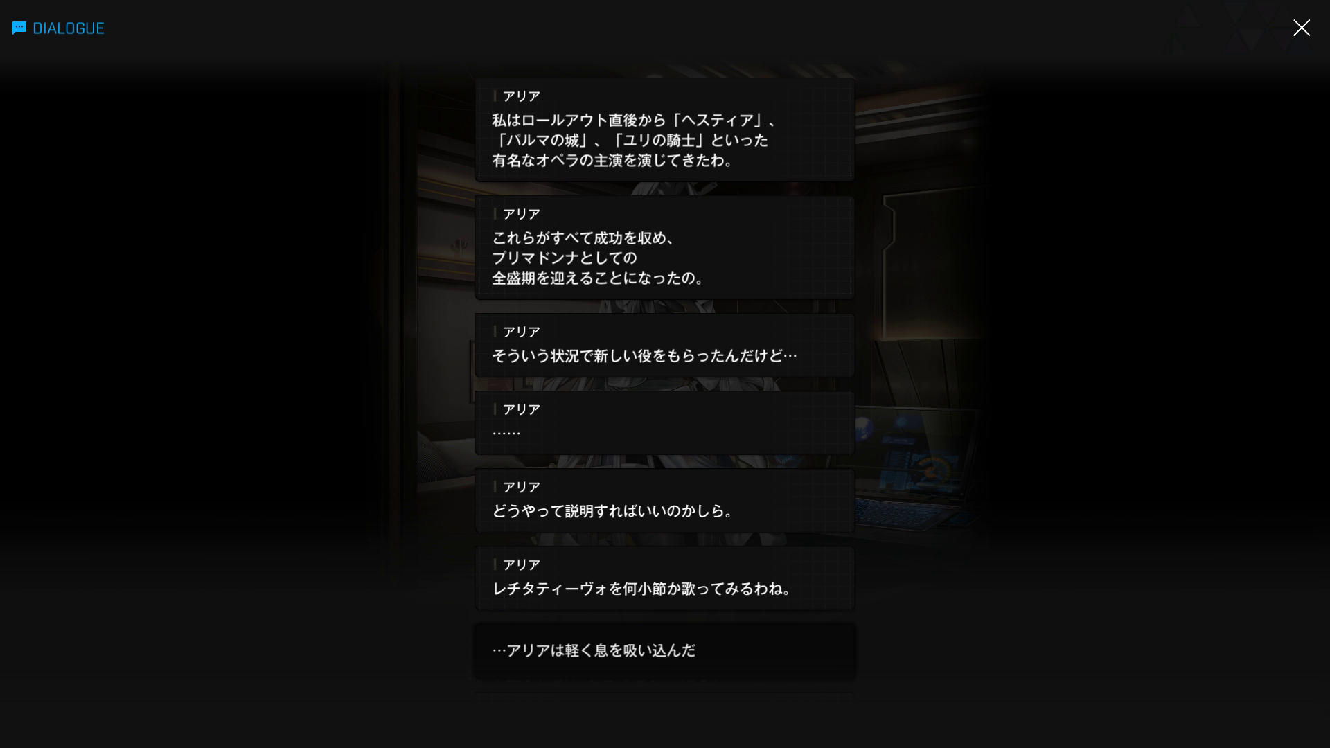 ・いくらマスタングがエンターテイメントに特化したニケの製造に秀でていたとしても、それを活かせる『能(脳)力』がなければ、以下SSのような名声は得られない → つまり、アリアは名前の文字どおり『いかに類稀なオペラの才能 & 高潔なプロ意識』の持ち主であるか、文面からでもひしひしと伝わってくる(アリアエピソード1より)