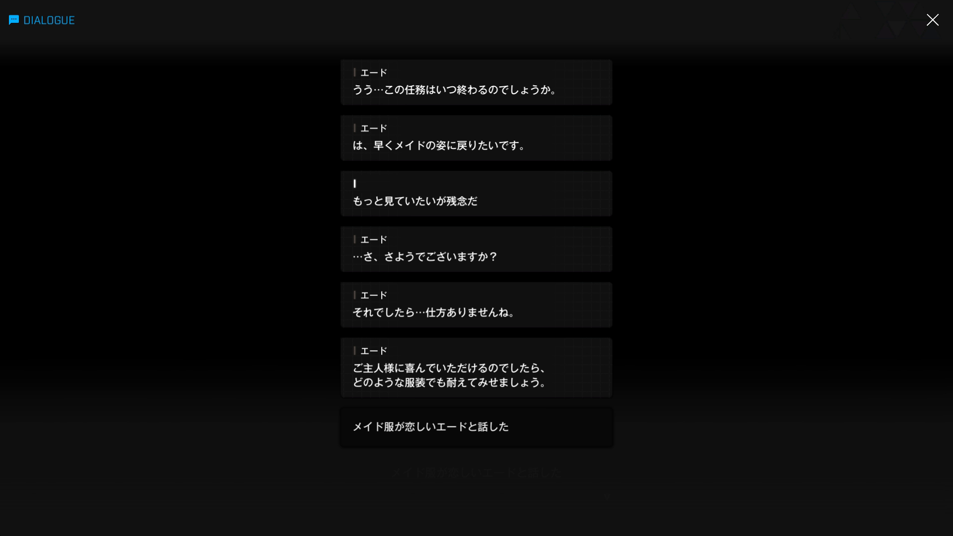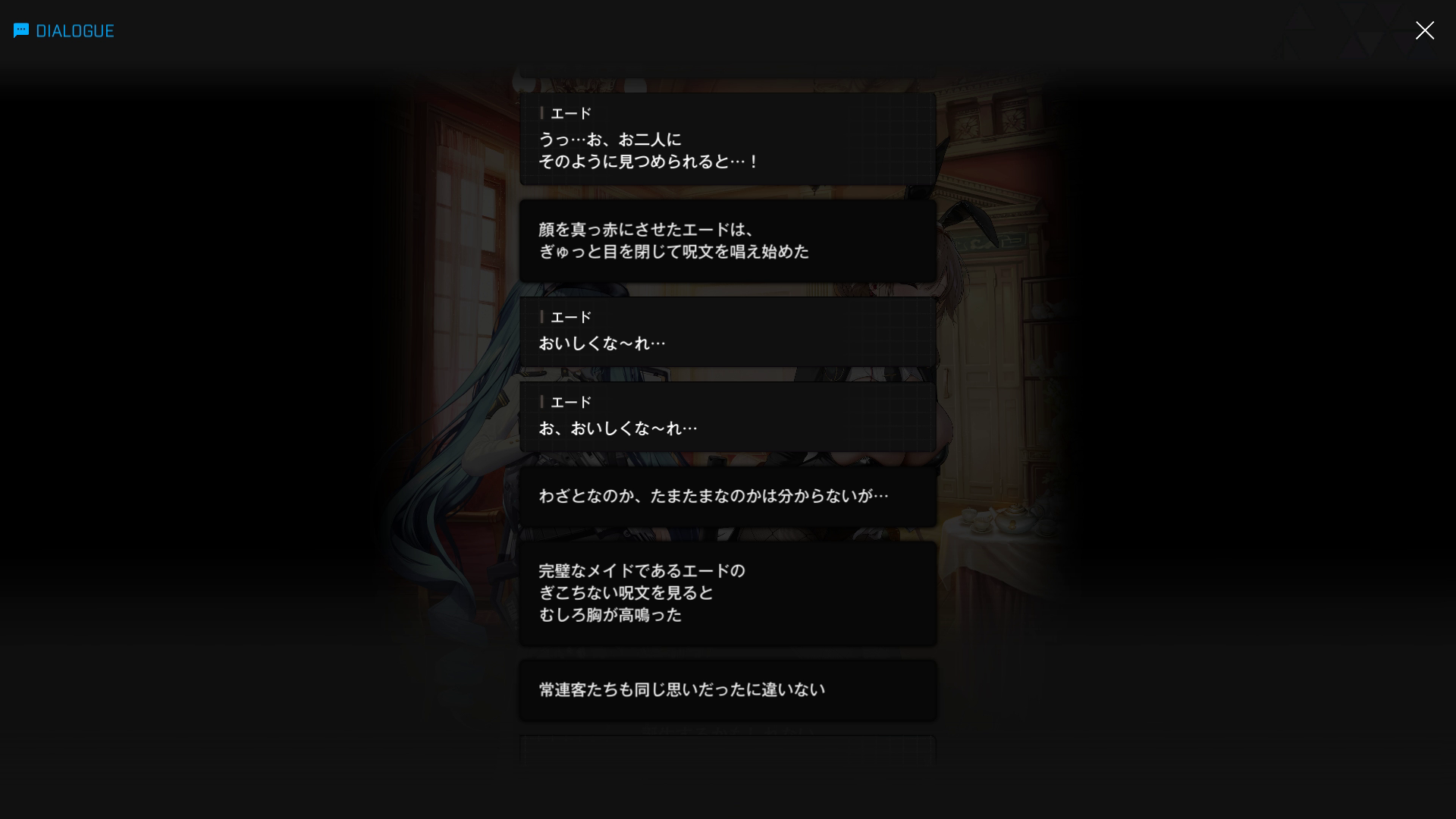 ・こちらで基本衣装エードの背景に見える黒いワゴンは、仕事のパートナー & すぐに修理を依頼するほどの愛用品 → これがないと、料理を一度に運ぶことができないため(エード面談:07より)
