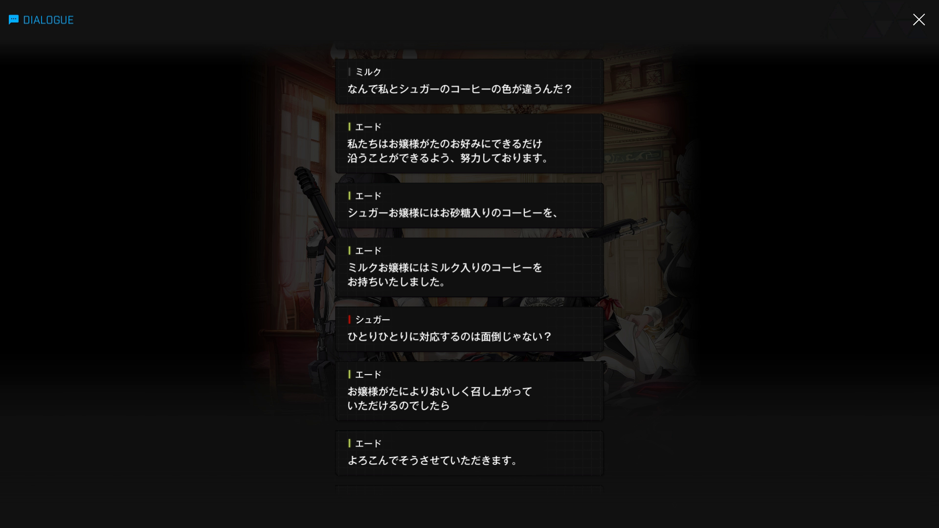 ●メイドカフェに半ばイチャモンを付けに来たシュガー & ミルクに対し、特に指示されていないにもかかわらず、彼女達の好みに合わせた色違いのコーヒーを提供する → ケチャップイラストの腕前もかなりのもので、シュガーに『かっこいいバイク』& ミルクに『大きな拳』の絵を描くほど(突発イベント『メイドカフェ』の『常連になる過程』より)