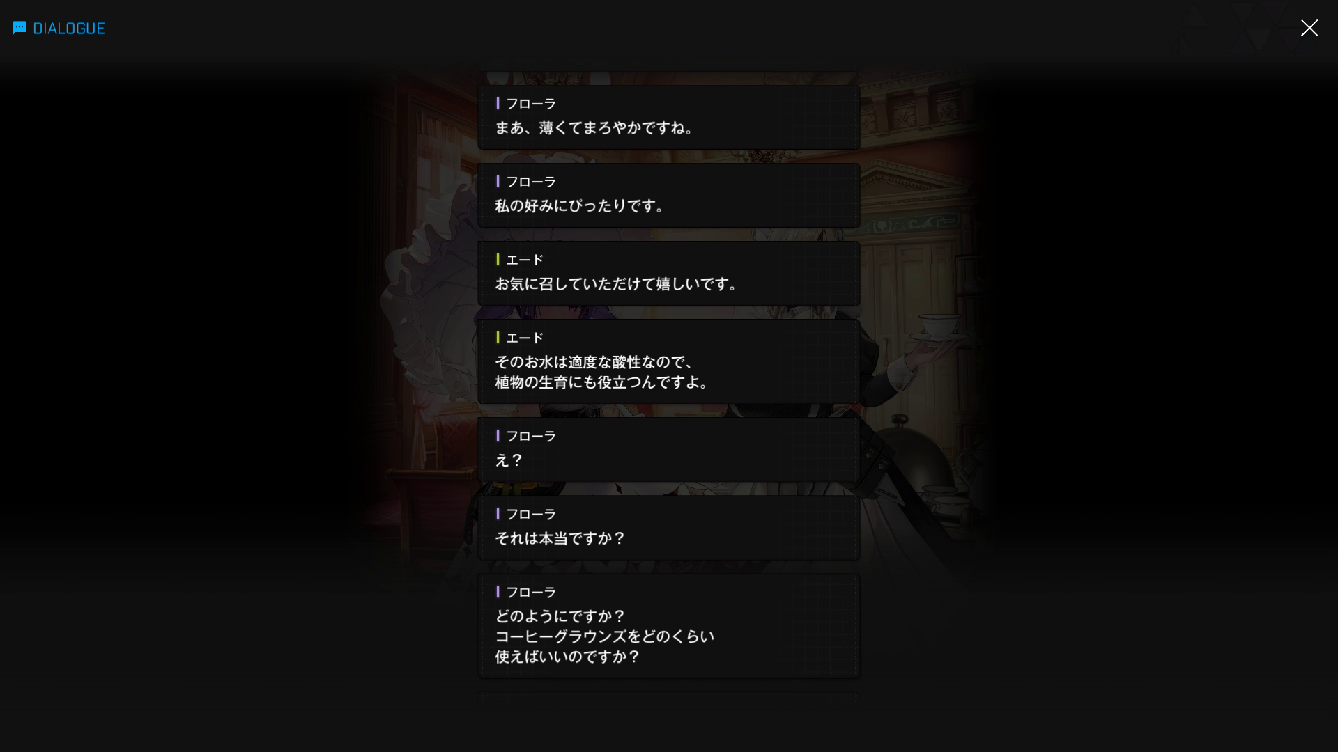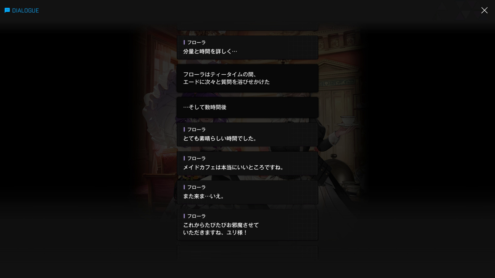 ●あちらで述べているとおり、本来は苦手なコーヒーをあえて注文したフローラのために、こちらの特製コーヒーを提供するなどした結果、以下SSのような展開に → 上記の2名同様、彼女も常連客としての来店が決定(突発イベント『メイドカフェ』の『初めてのメイドカフェ』より)