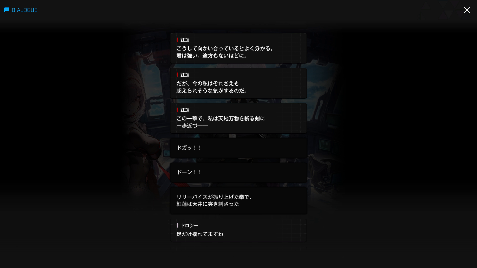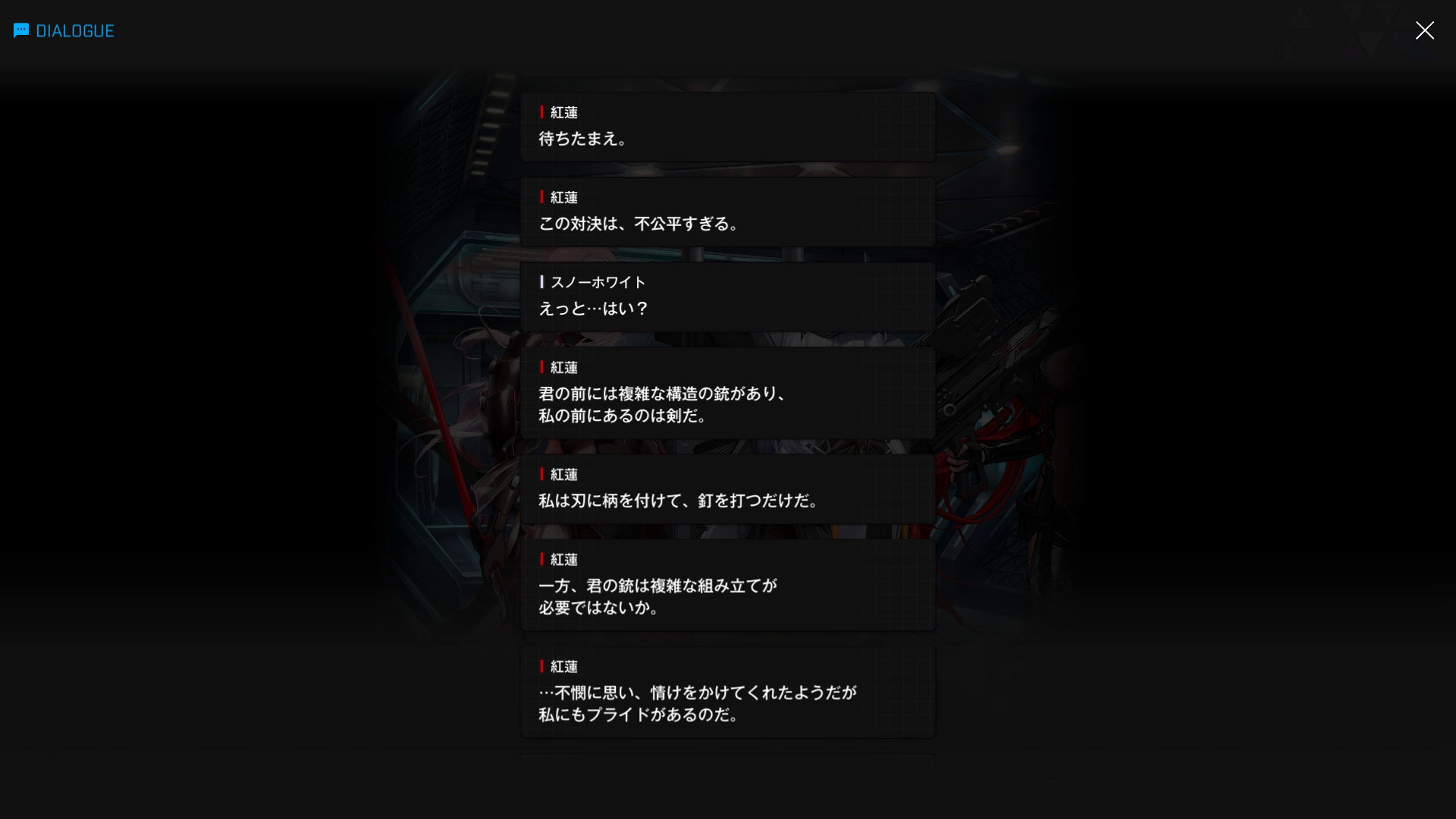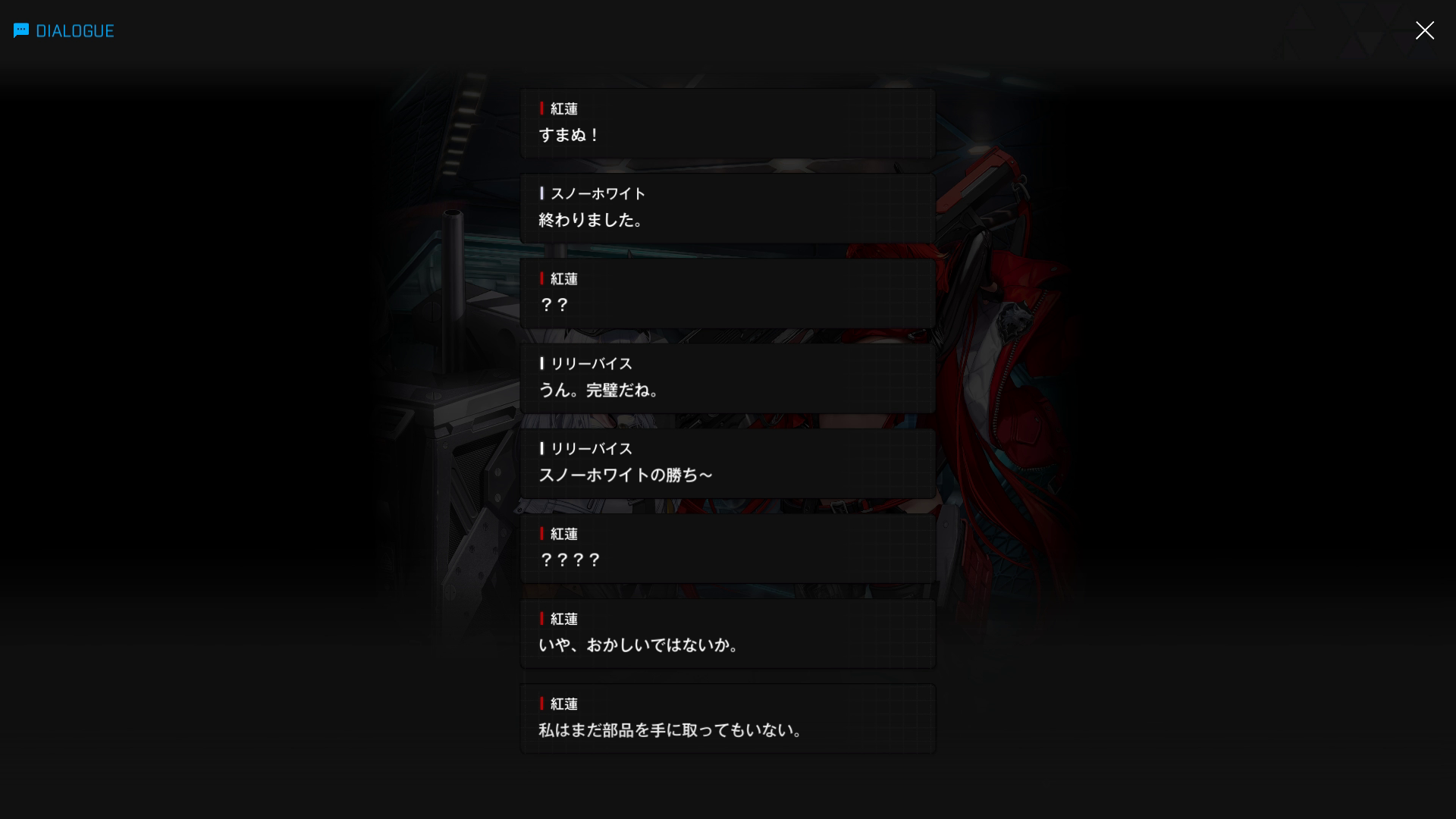 ・こちらのスノホワID同様、エピソードは当時の状況 & 面談内容は『思考転換後の白紅蓮が自分の過去を回想する』という特殊な形式で話が進む → そのため、会話相手は主人公の代わりにゴッデス指揮官が担当している