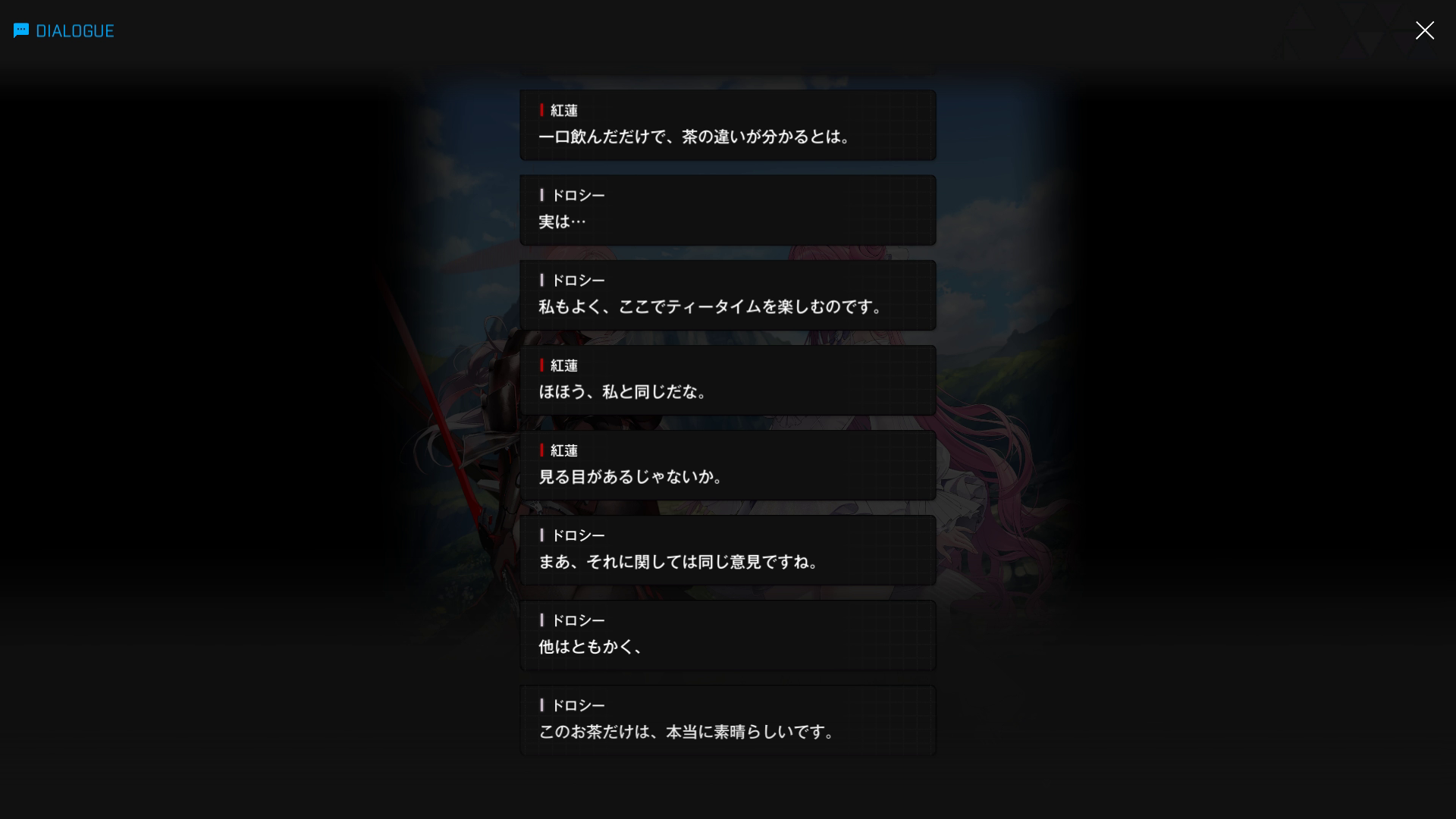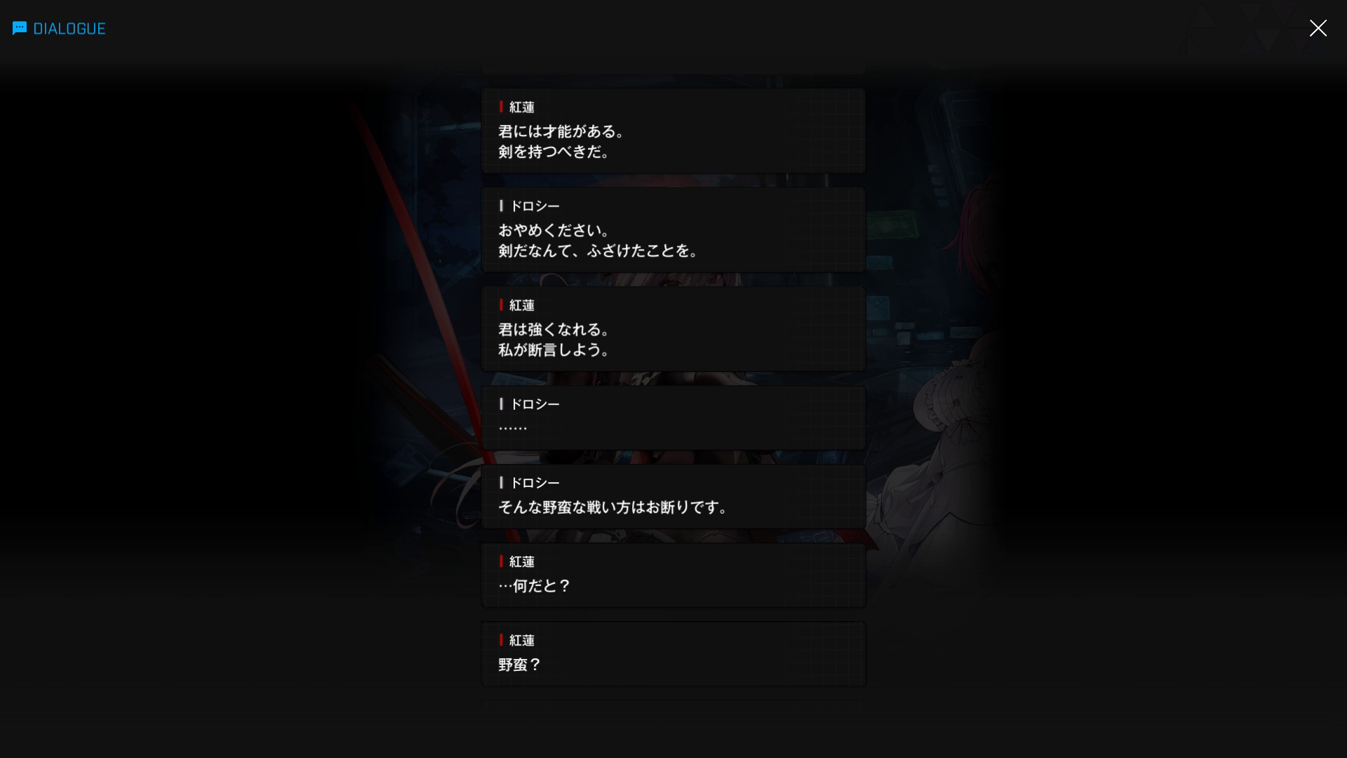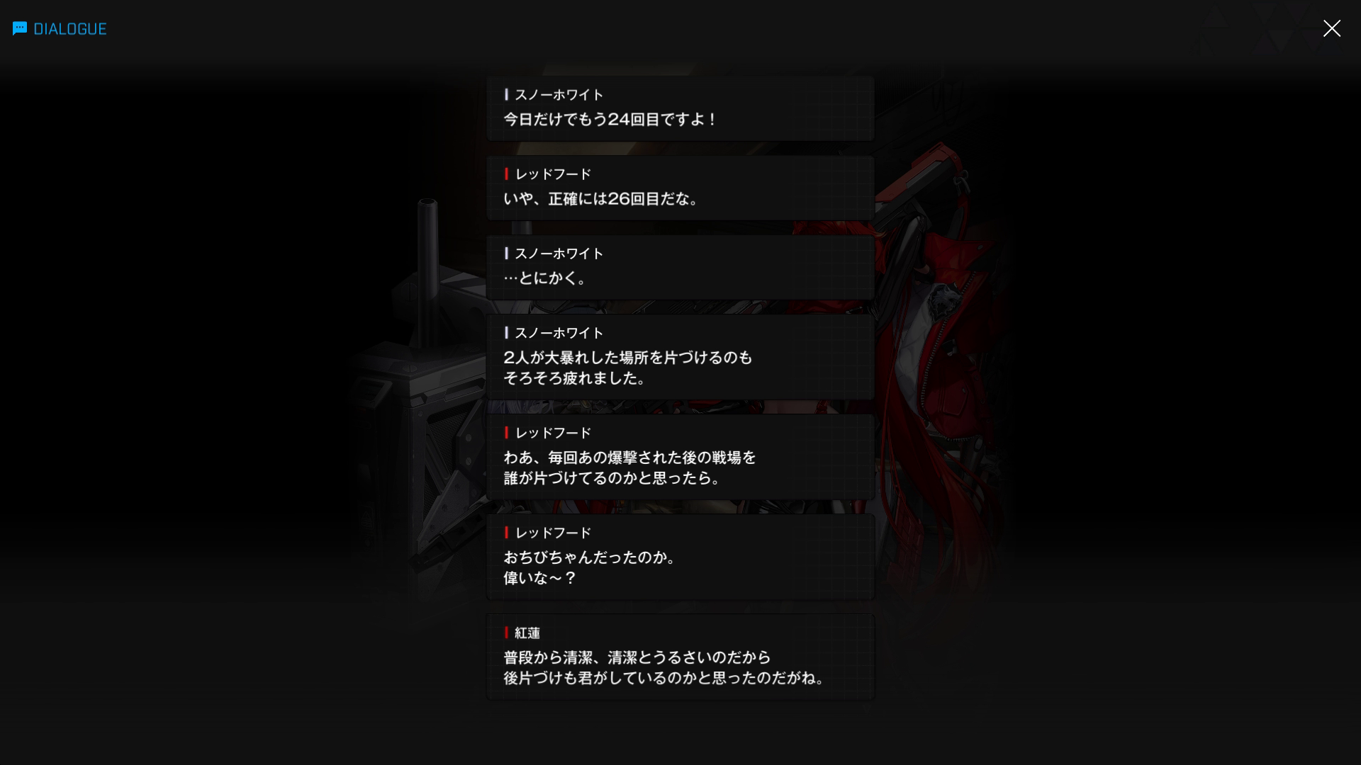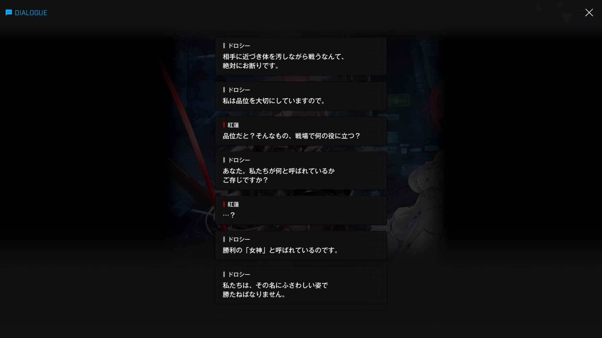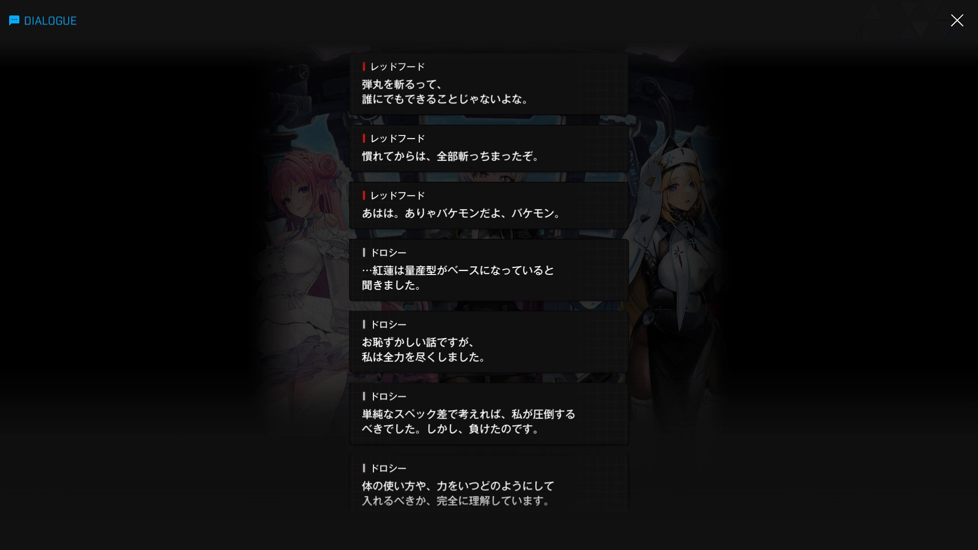 ●エピソード4:ドロシー戦 → 以下SSのような内容で挑むも、2分間の膠着状態後、ドロシーが2枚目最後にあるレッドフードの一言で吹き出してしまい、その隙をついて勝利(勝者黒紅蓮 & ここまでの戦績は5戦中1勝4敗 = 勝率20%)