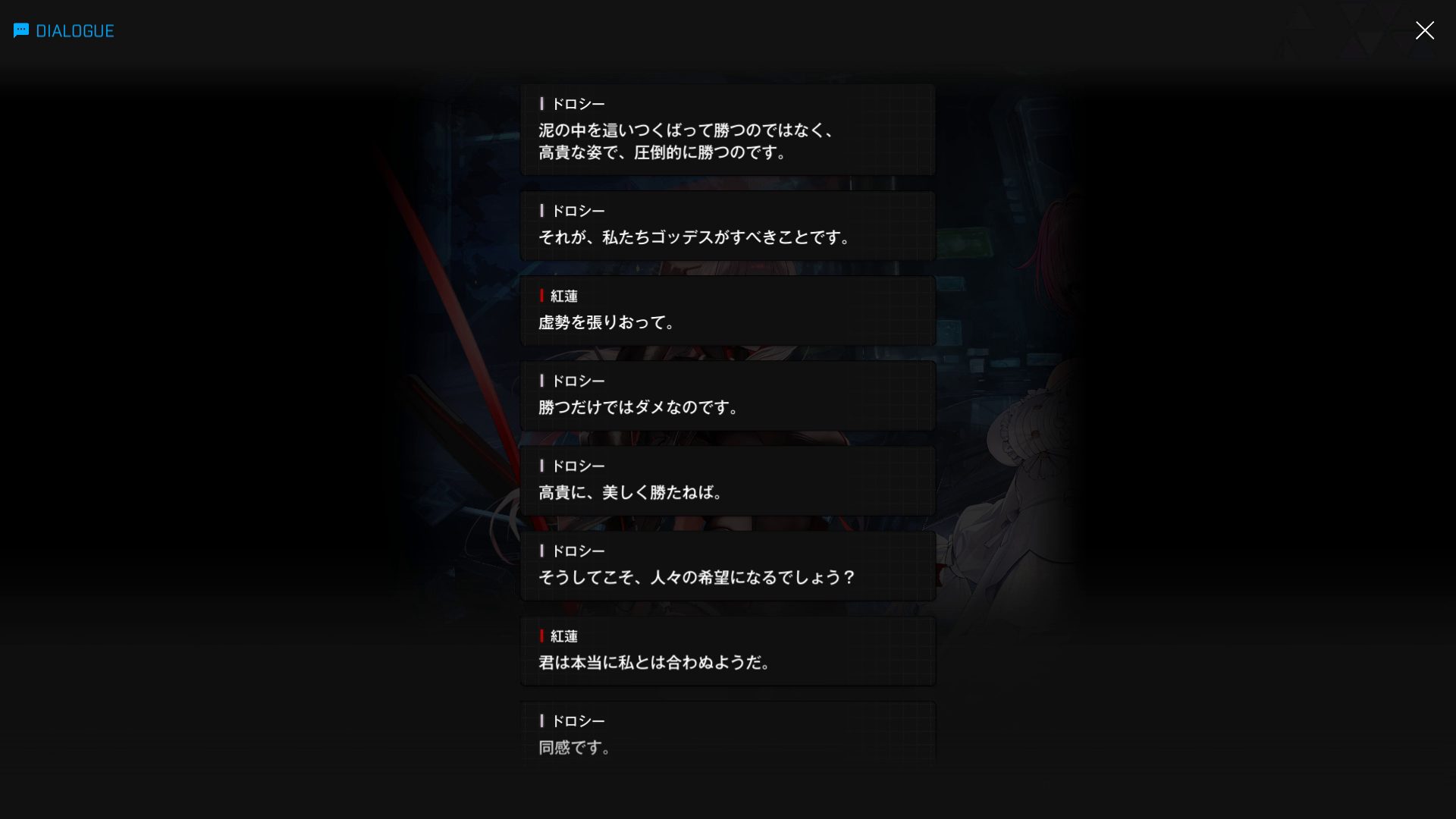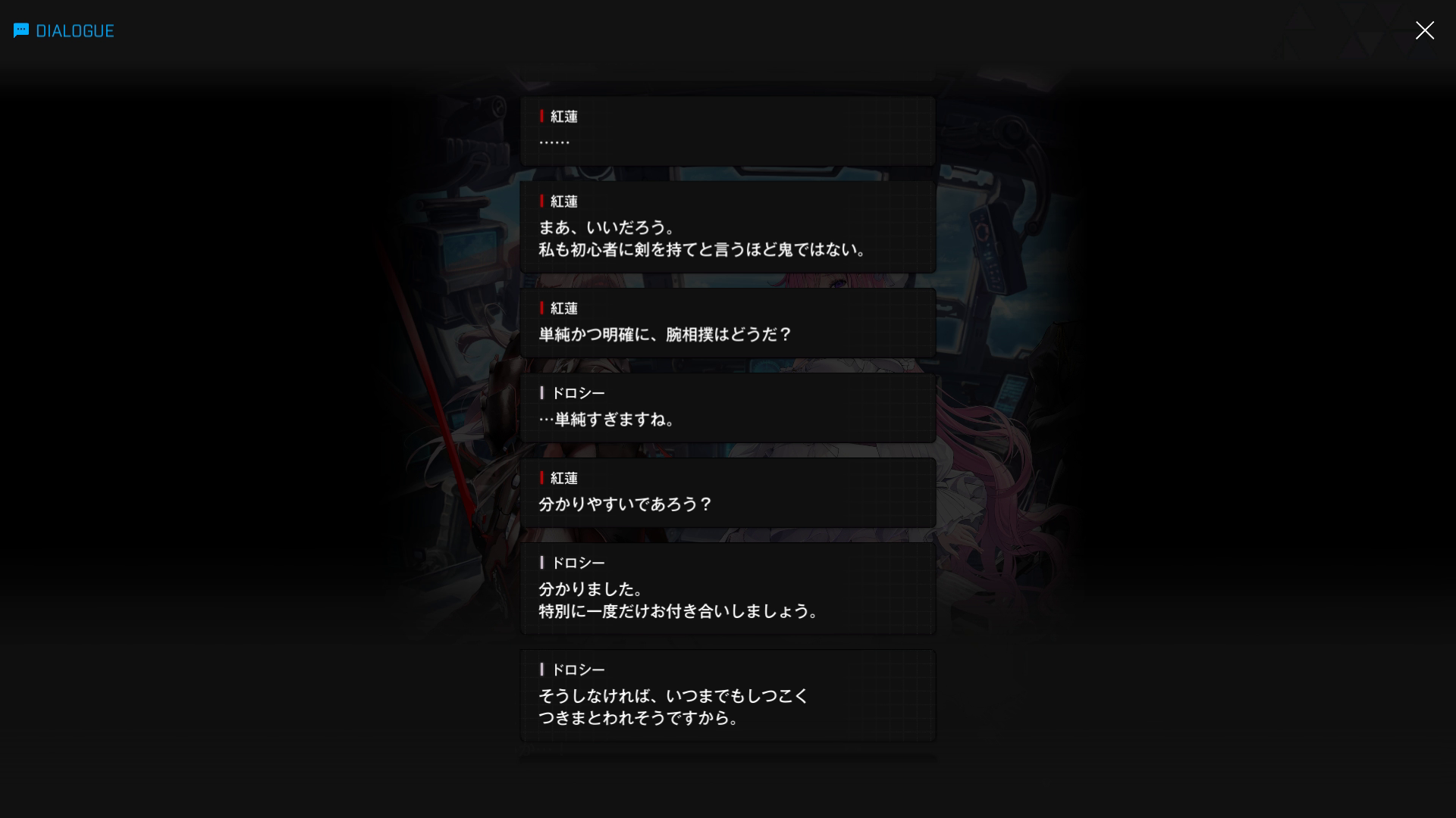 ドロシーとしては「味方の妨害に遭った(裏切られた)」わけで、黒紅蓮としても納得のいく勝利ではなかったはず → すぐに彼女のあとを追い以下SSのように話しかけるが、これがきっかけとなり、以降事あるごとに喧嘩を繰り返すように