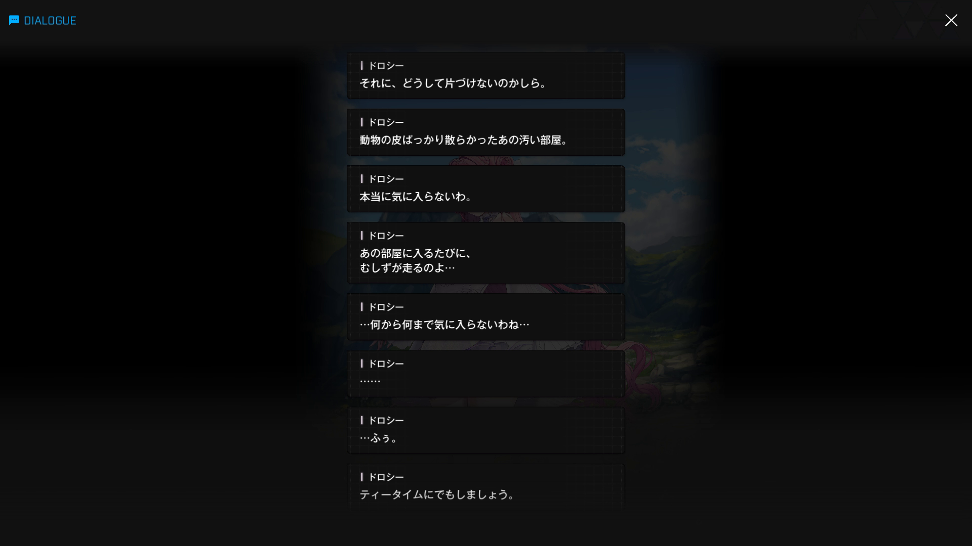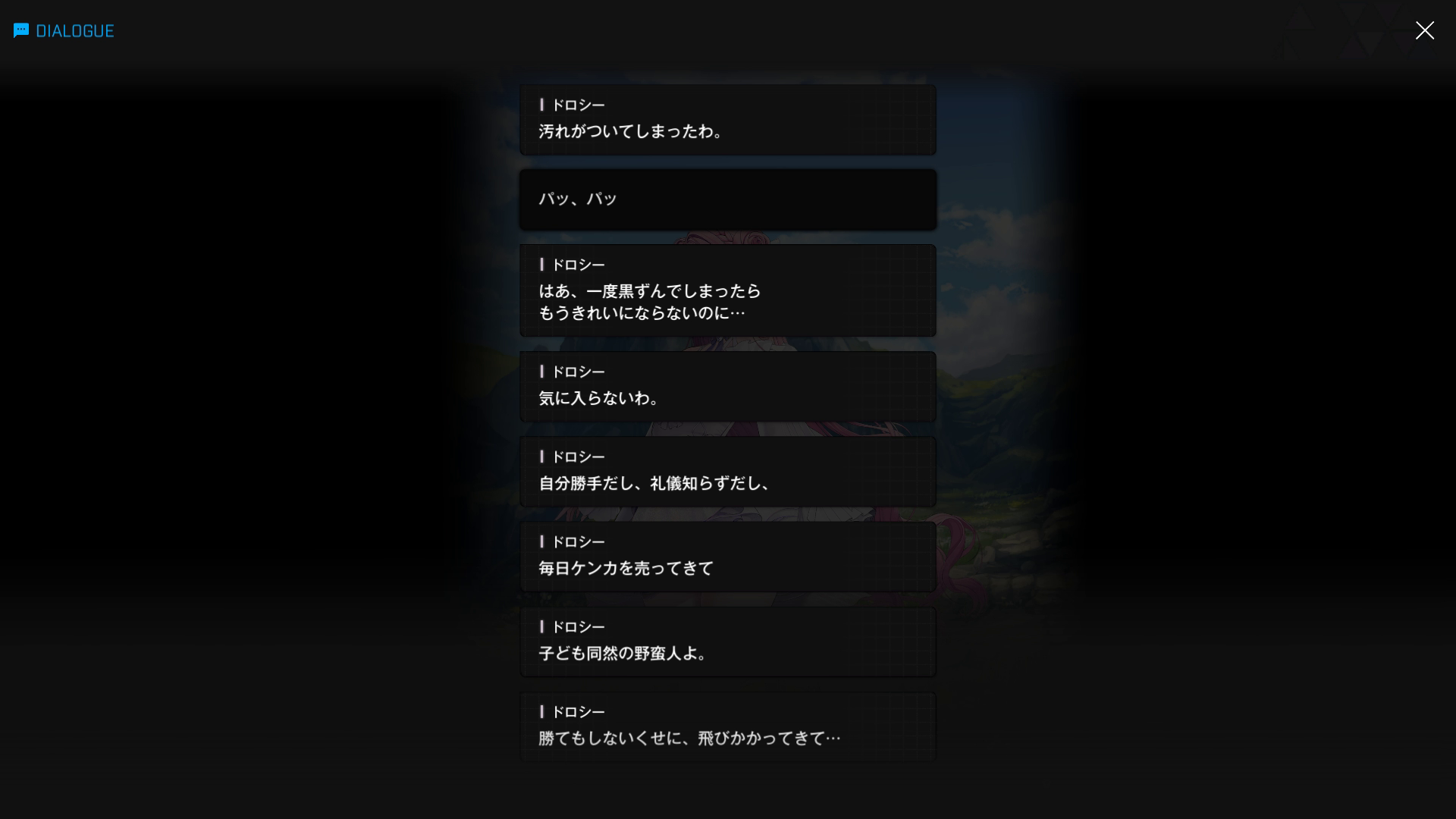 ・ドロシーからすれば、「ストーカーも真っ青になる粘着ぶりを惜しみなく?発揮 & ドレスを汚す迷惑極まりない相手」だったため、当初は以下SSのように罵っていた(遺失物『イベント』の『エレガンス & ワイルド:02』より)