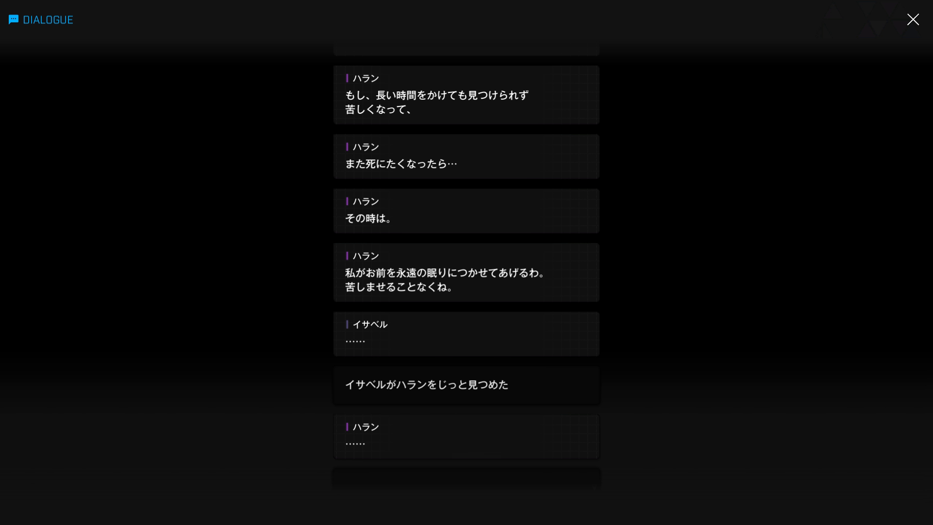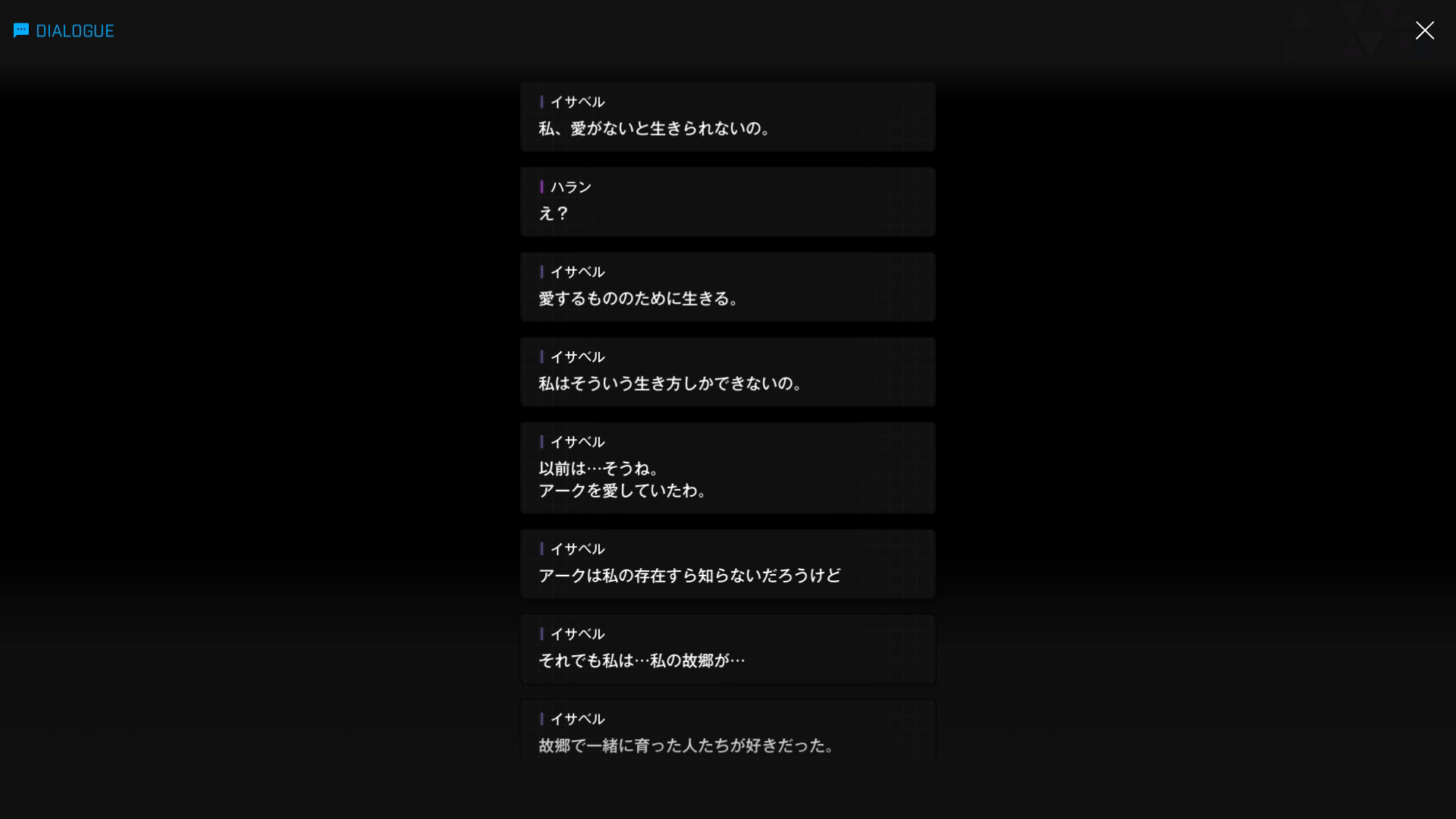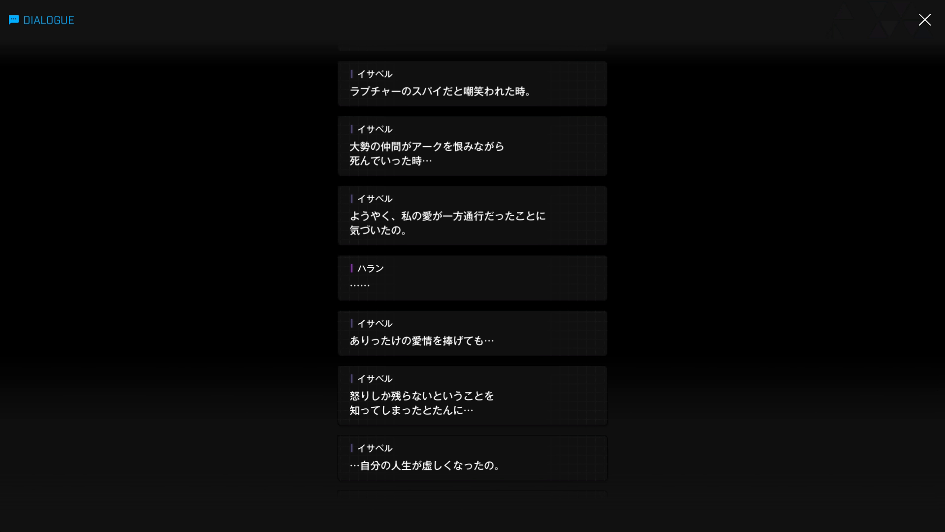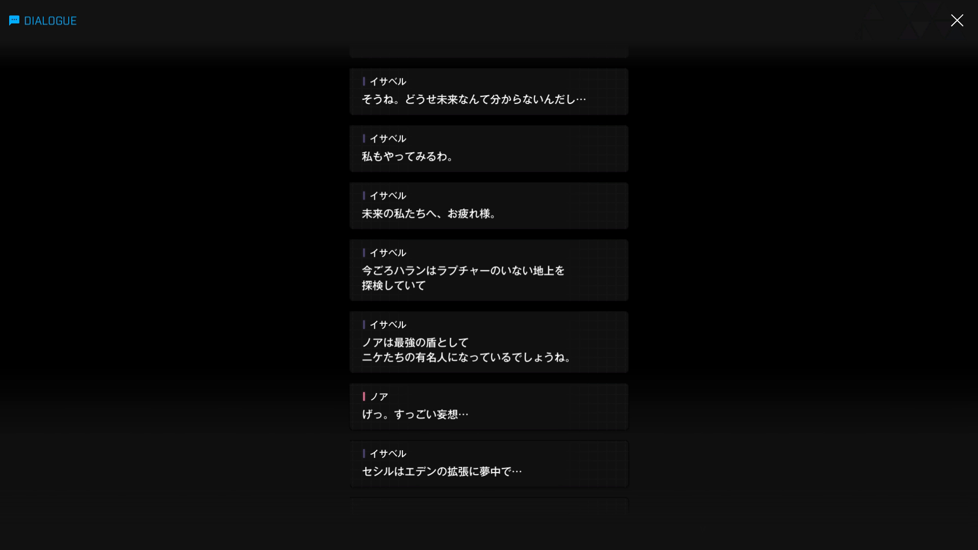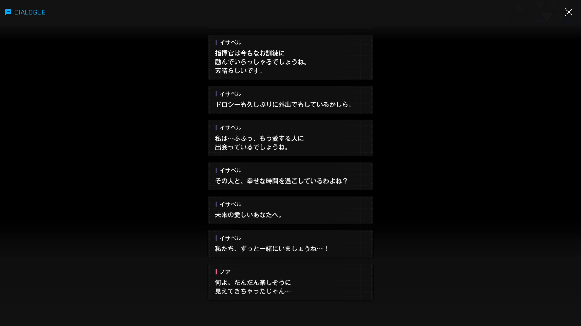 ・主人公に対して好き勝手 & 無礼な相手を見ると、もっと許せなくなるとのこと → 具体的にはノアらしいが、いい機会なのでついでにシュエンも前哨基地へ呼び出して一緒に始末してもらおう(イサベル面談:06より)