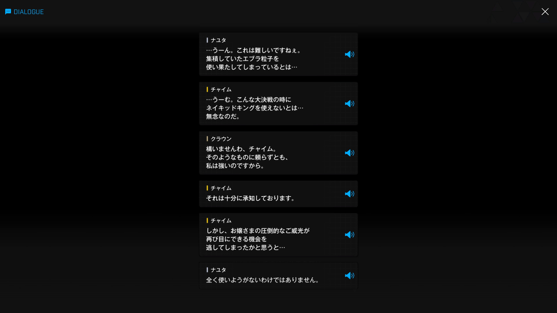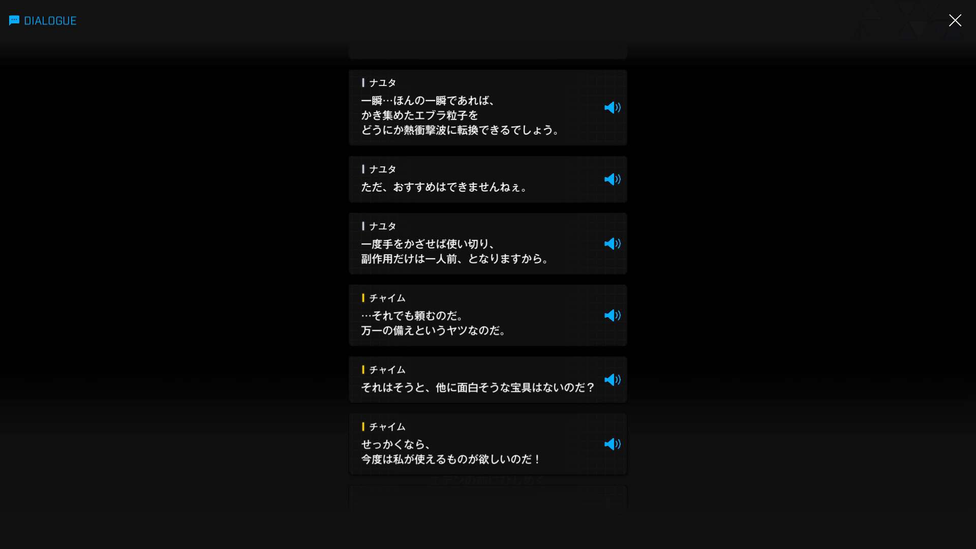 ・その後、エデンに合流 & ナユタの分身を利用した一発勝負にも参戦 → イサベル達が宇宙ステーションを墜とす間、チャイムとトロンベに相乗り状態で縦横無尽に駆け回り、手当たり次第ラプチャーを殲滅していく(『天空を彩る翼:B』より)