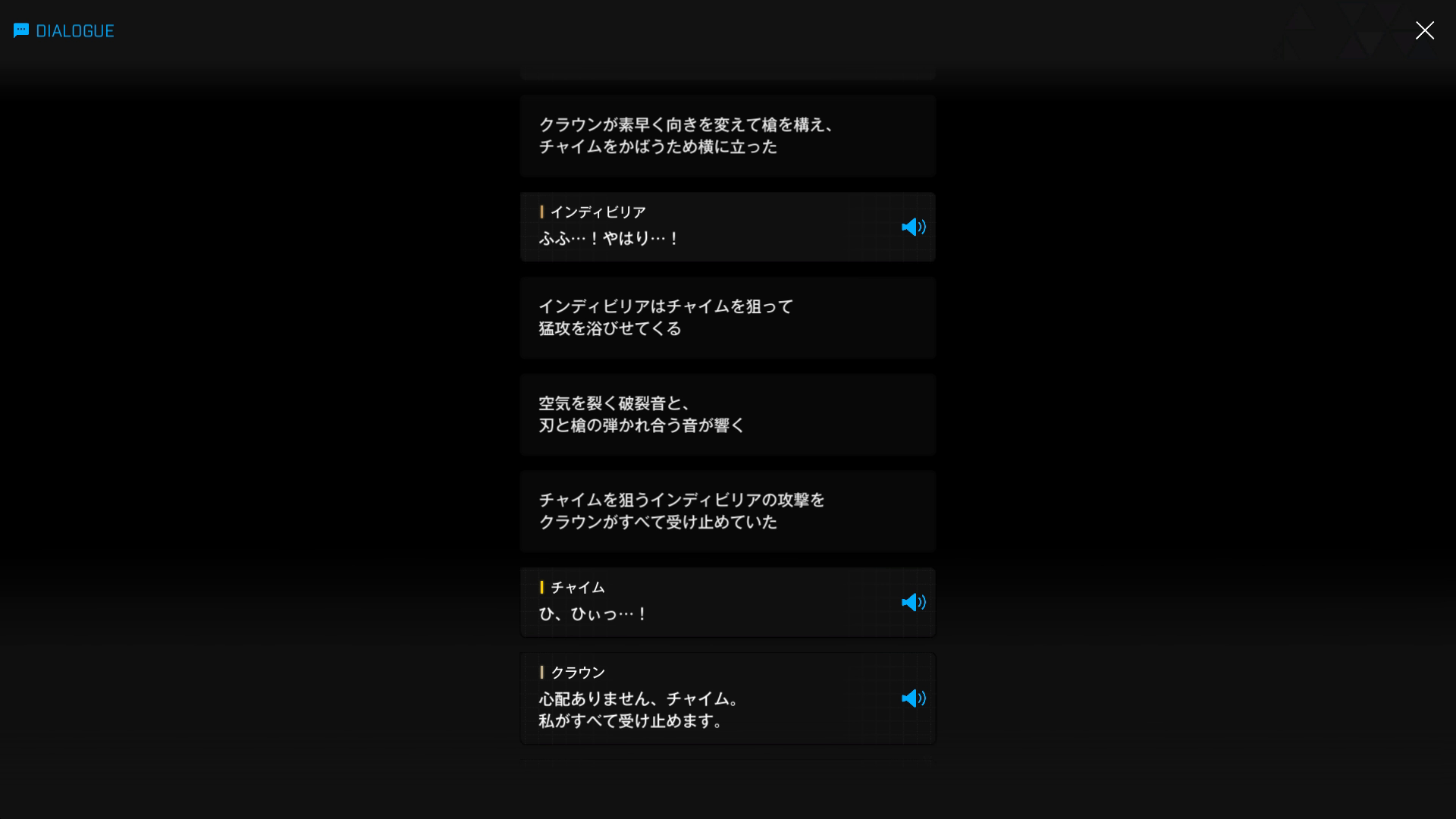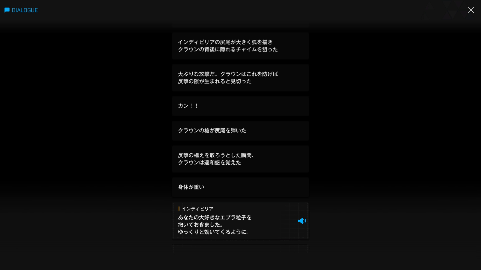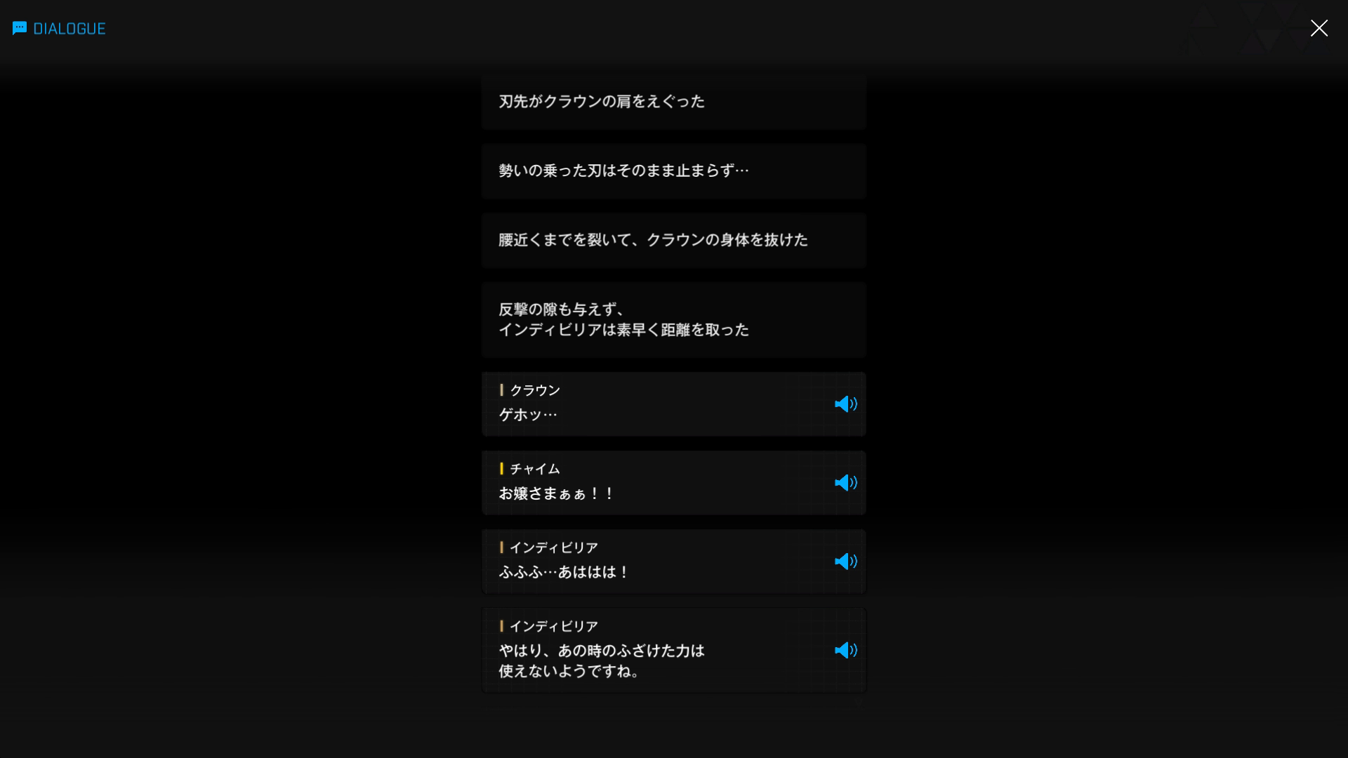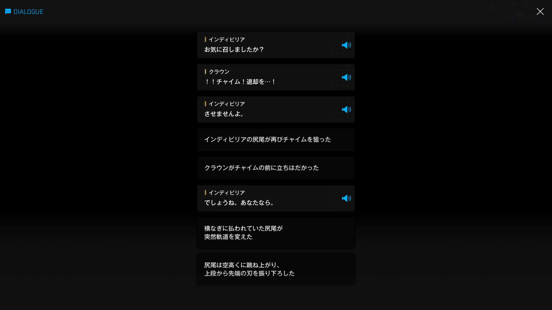 それにしても、ボロボロの状態でもだえているものの、そのような攻撃に3連発耐えきったインディビリアもかなり異常 → ムービー中の攻撃も含めれば計6発になるが、おそらくクラウンはチャイムにとどめを刺させるべく手加減したはず