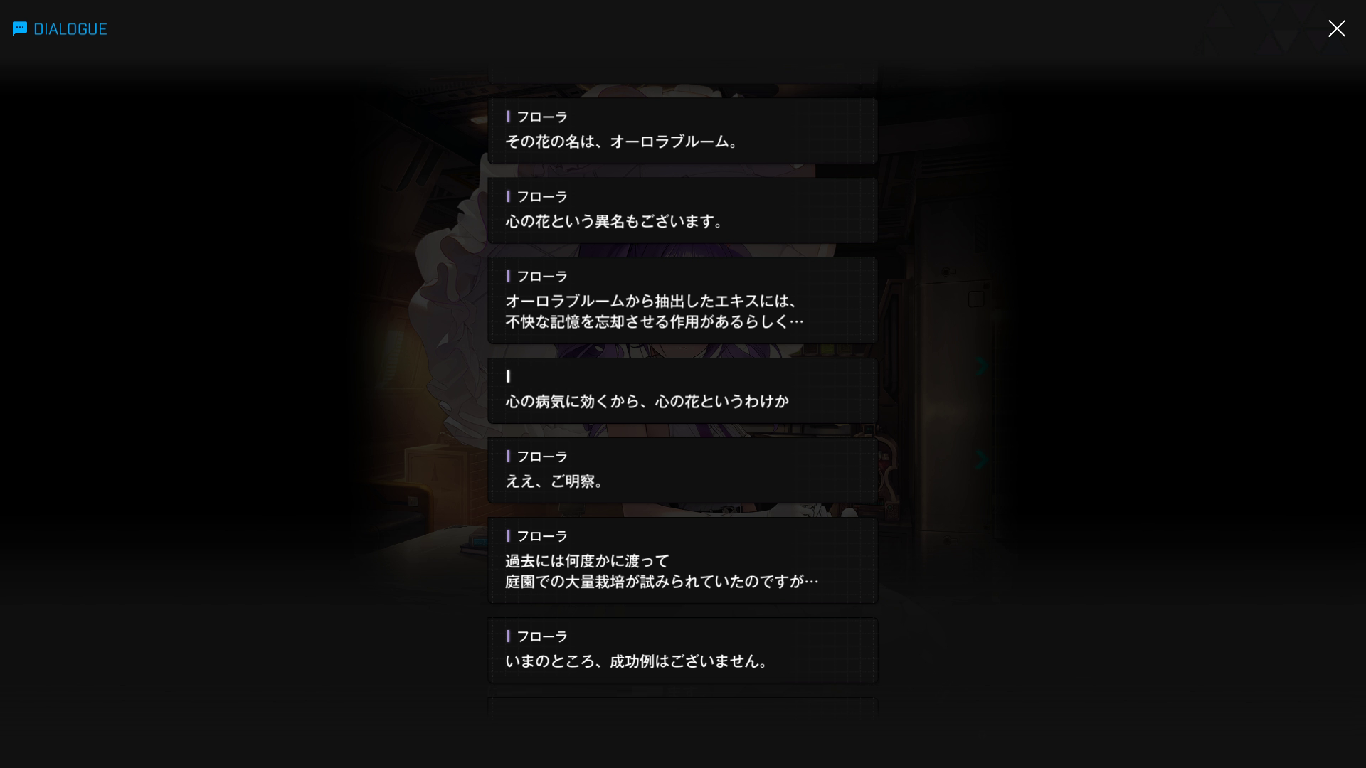 ・『中央政府公認 & アークでオンリーワンのアンチエイジング注射』で、フローラ & マナ曰く「かつてはロイヤルのみが接種できた薬品」&「一次侵攻直後、アークに移住した当時は生産システムがきちんと構築されていなかったため、価格が安定するまではロイヤルのみが享受できるぜいたく品」だったらしい → 現在は、その気さえあれば誰でも接種可能だが、気になるお値段の方は不明(イベント『FOR REST』より)