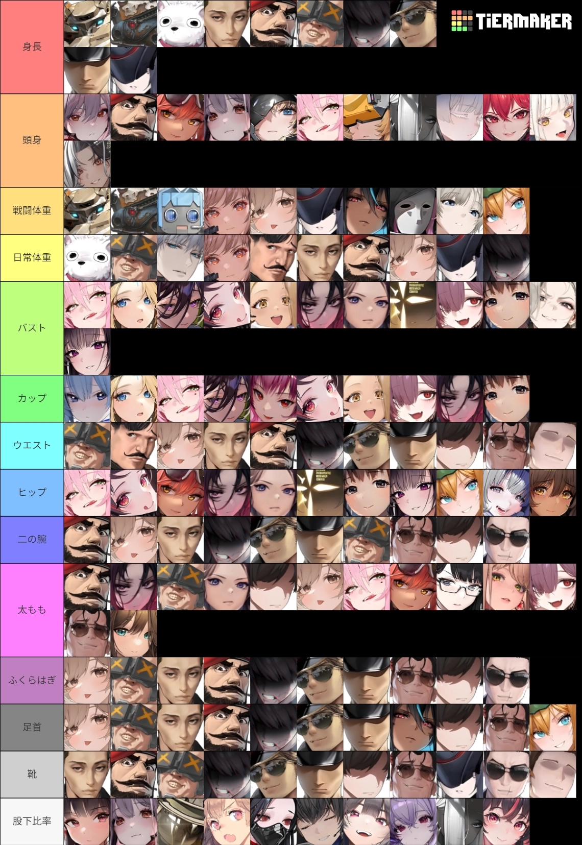 ※Tier表の見方はこちら同様、『左に配置されたニケほど高順位』という並び方 → 基本的に表示は10名までですが、10位の人物が複数いる場合、該当者を全員紹介しています(『頭身』は I-DOLL サン以降の6名、『バスト』はE.H.以降の7名、『太もも』はエマTU以降の4名、『足首』は黒色男性以降の3名、『靴』は清明会組員以降の2名)