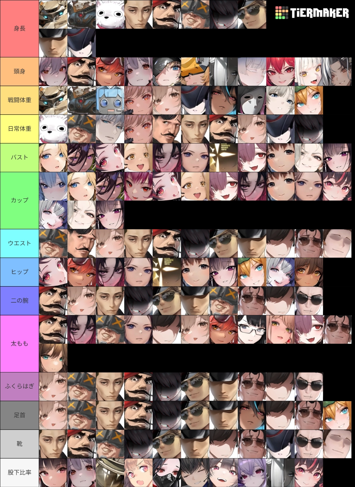 ※Tier表の見方はこちら同様、『左に配置されたニケほど高順位』という並び方 → 10位の人物が複数いる場合、該当者を全員紹介しています(『頭身』は I-DOLL サン以降の6名、『バスト』はE.H.以降の7名、『カップ』はイングリッド以降の5名、『ウエスト』&『足首』は黒色男性以降の3名、『太もも』はエマTU以降の4名、『靴』は清明会組員以降の2名)