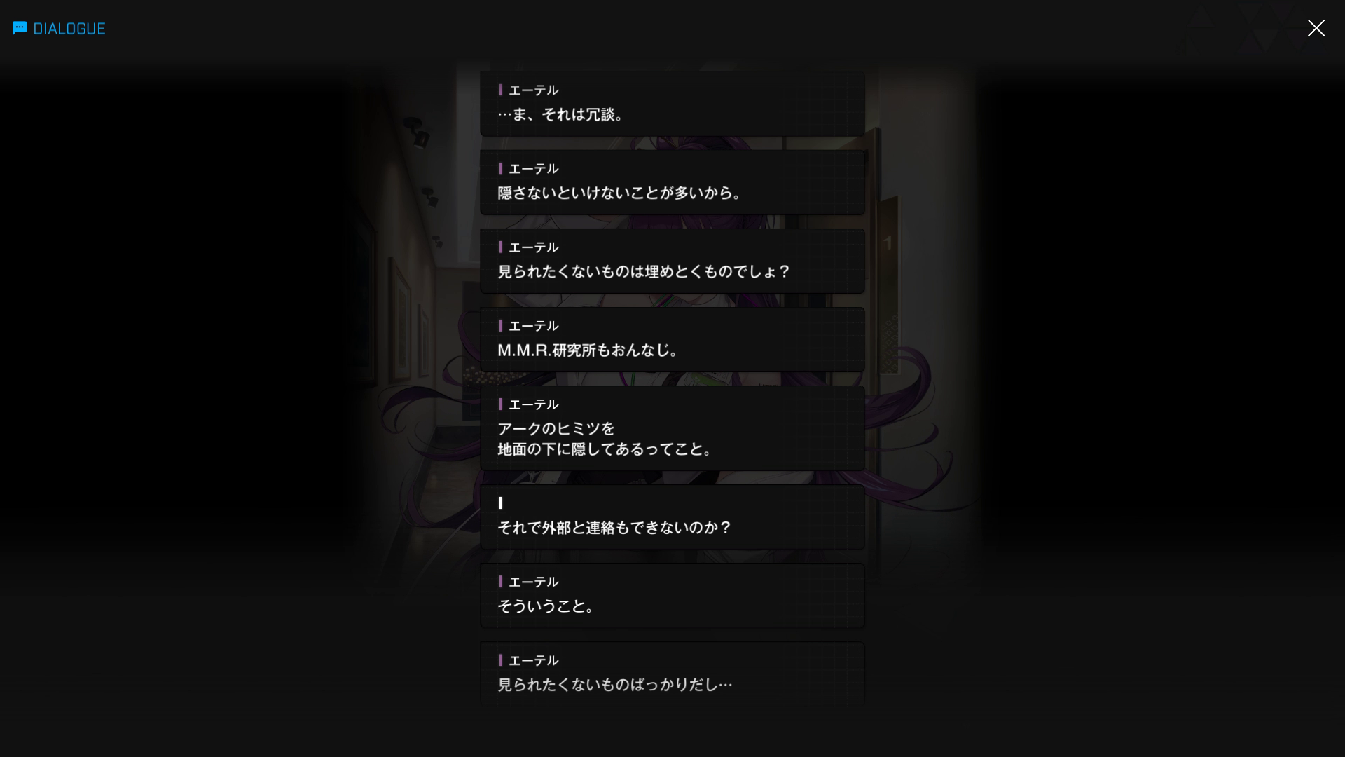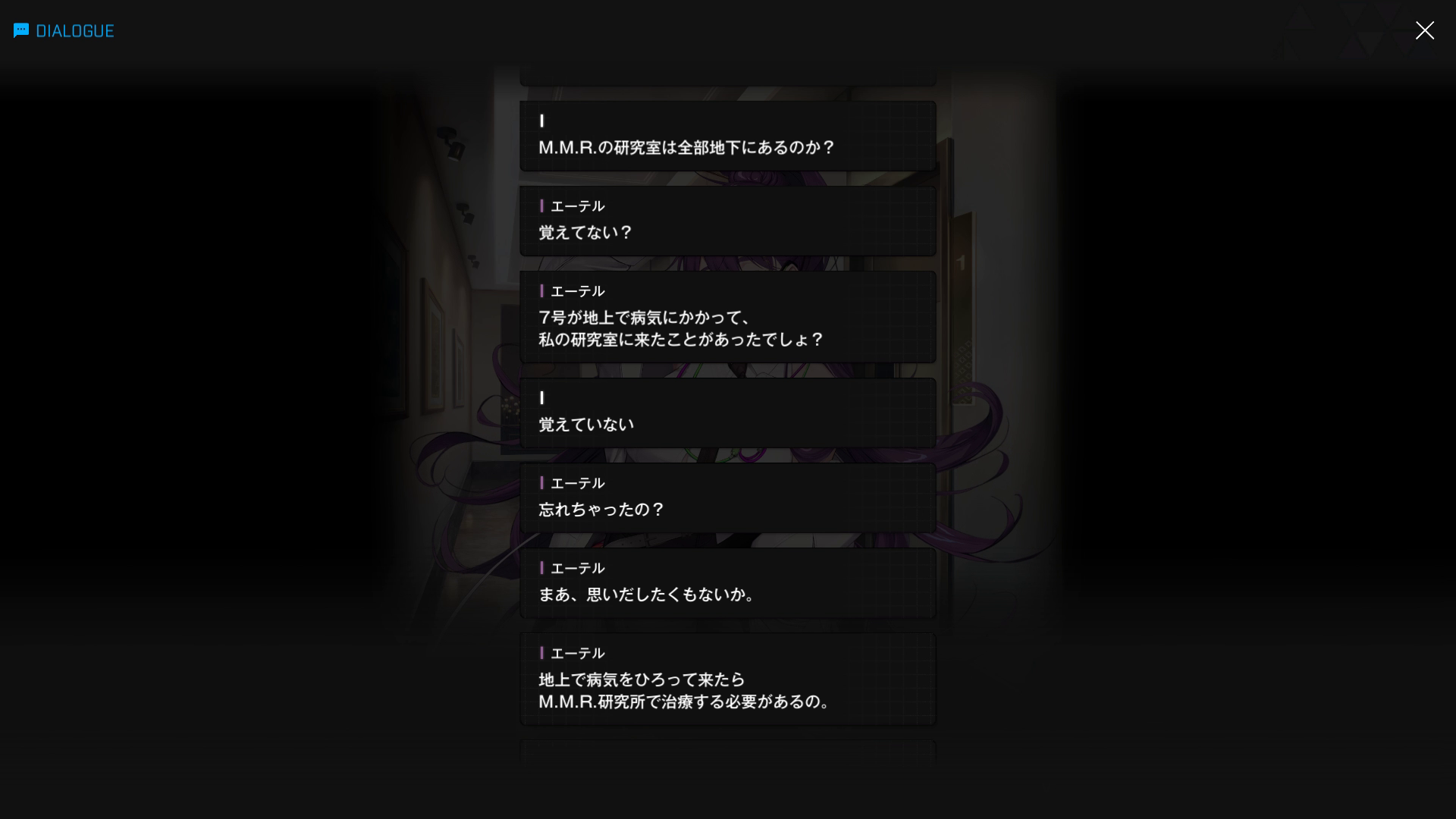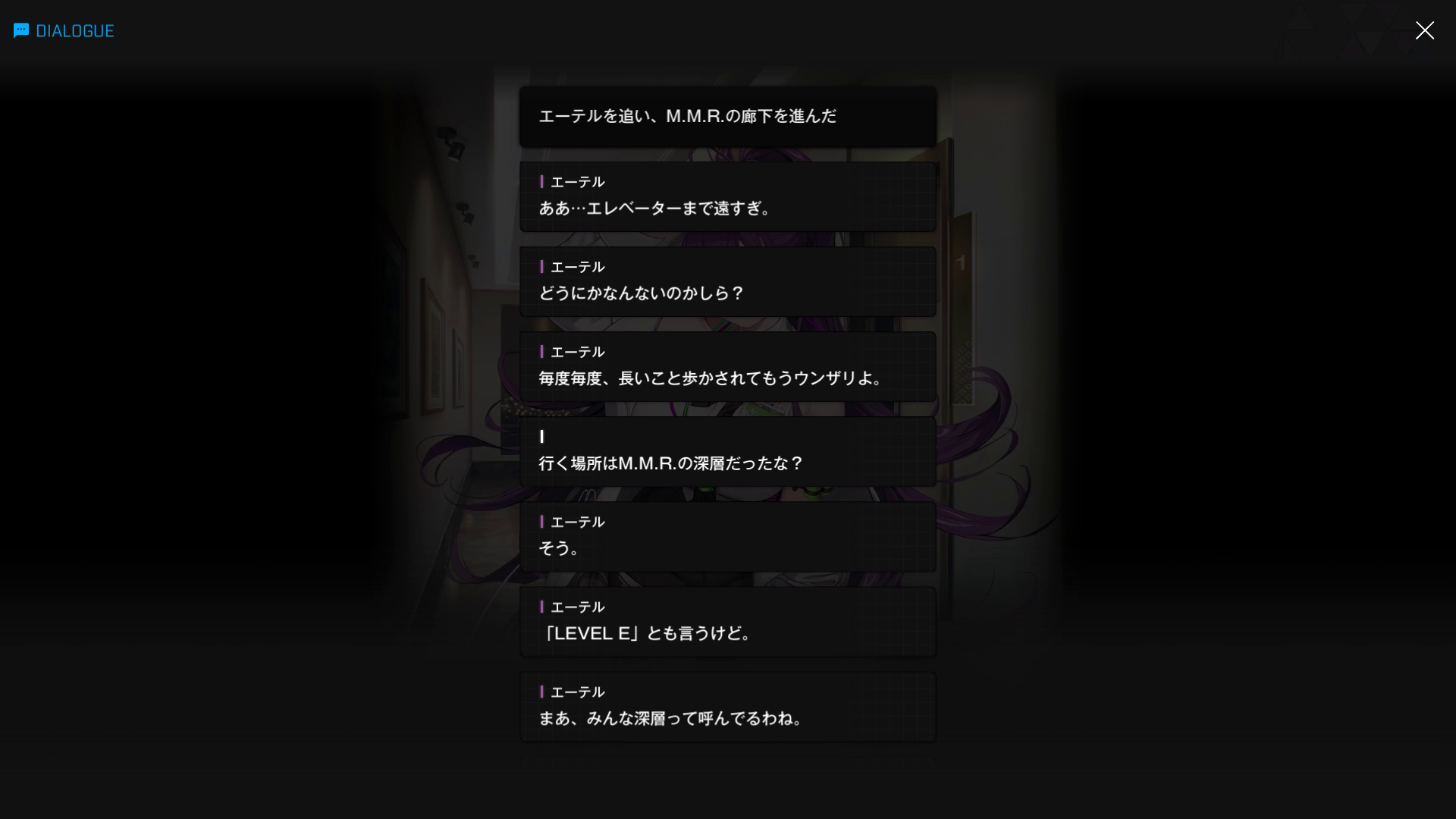 ・M.M.R.の構造などについて、まるでエーテルが専属ガイドのように色々と説明をしてくれる(『深層へ:A』より)