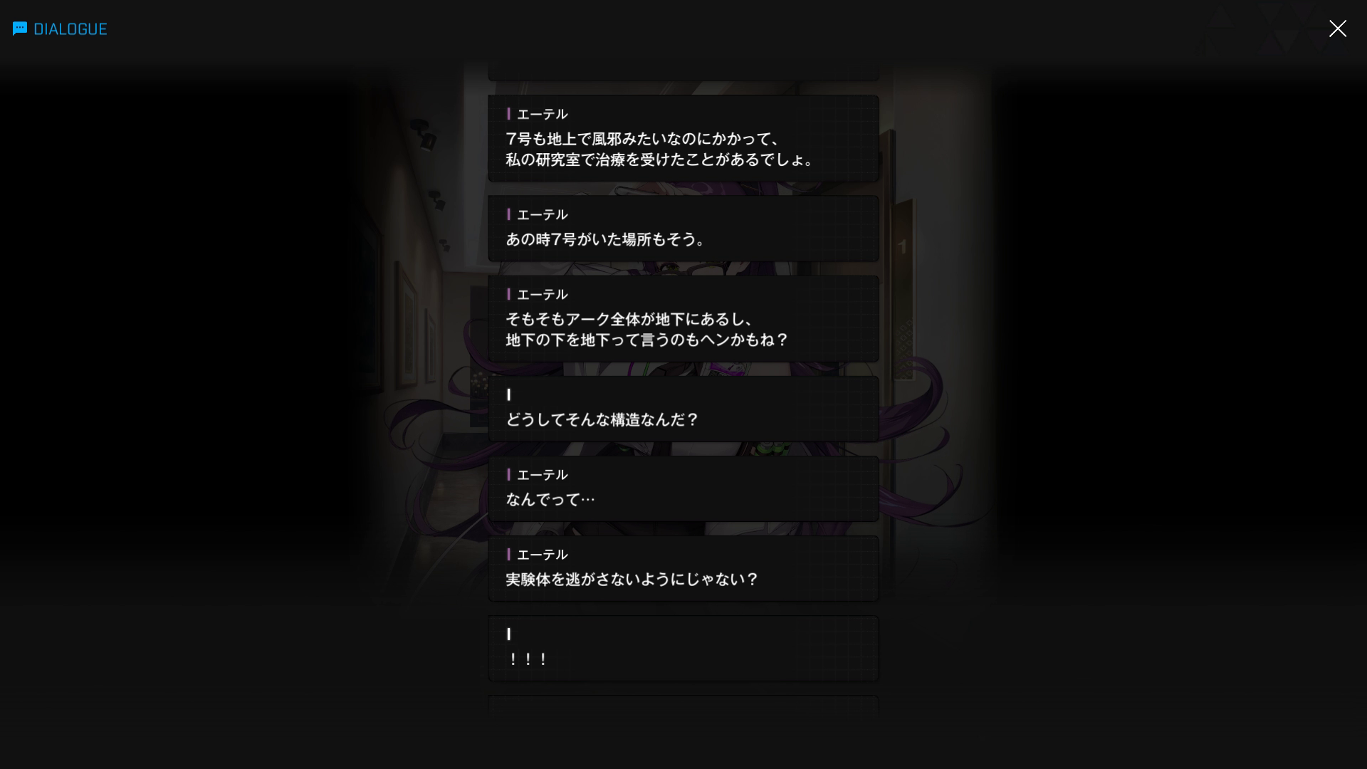 ・建物(研究所)の具体的な大きさは不明だが、エーテルが主人公に『他の階へ移動を禁止』した理由は、「階ごとに種類の違う1つのウイルスを研究している」ため(エーテルエピソード4より)