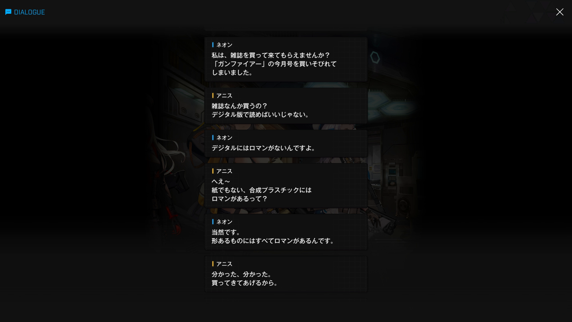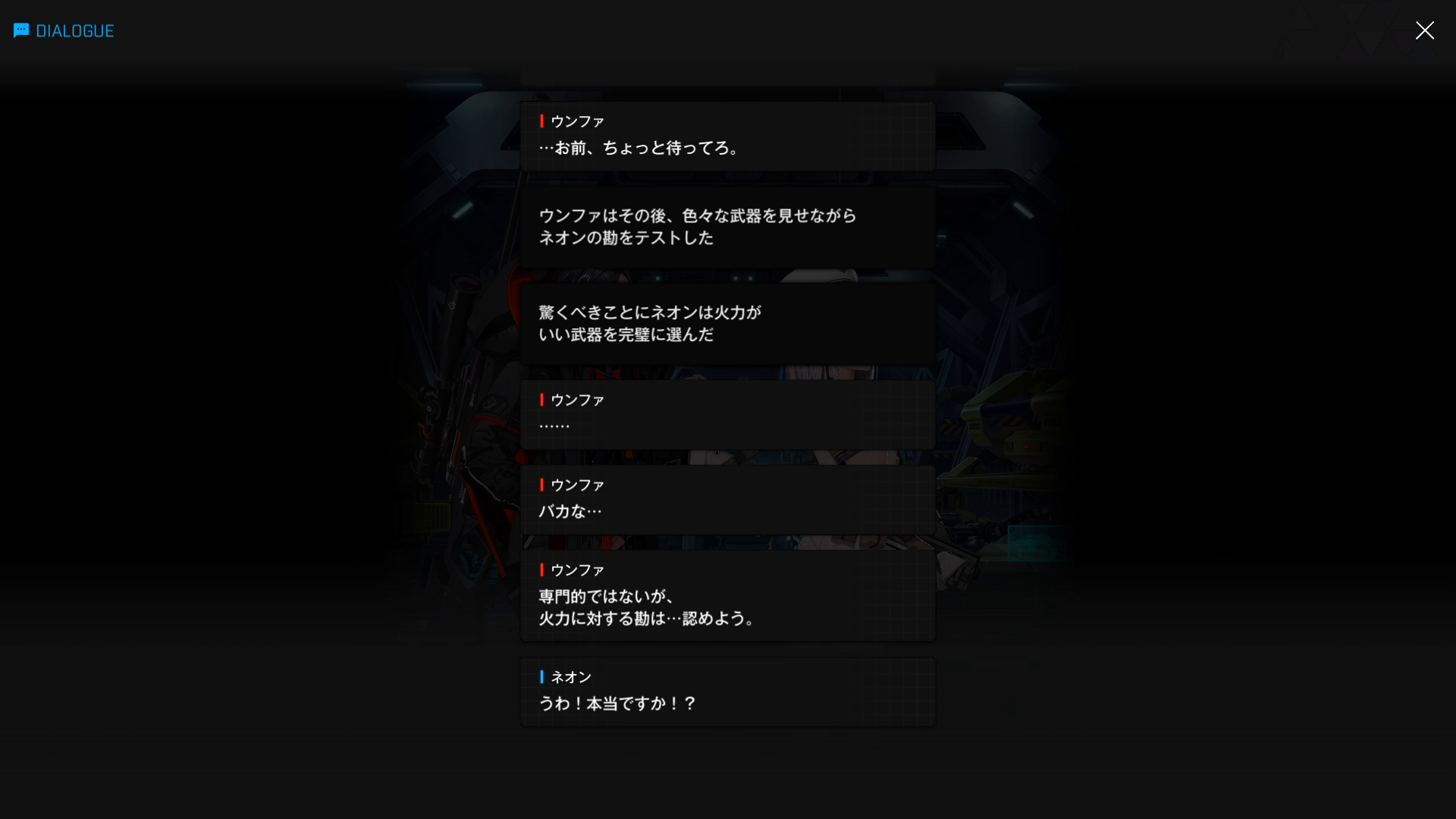 こちら & 上記のとおり、確かに多少融通が利かない性格 or 常識外れの行動をしていることは否めない → しかし、イベント『ABSOLUTE』では負傷しながらもウンファTUに手信号で合図を送ってサポートするなど、管理人が好きなニケ上位に入るタクティカルさを持つ(SSRランクのくせにテロを起こすやつ or 某ニケの頭部強奪犯は、彼女を見習うべし)