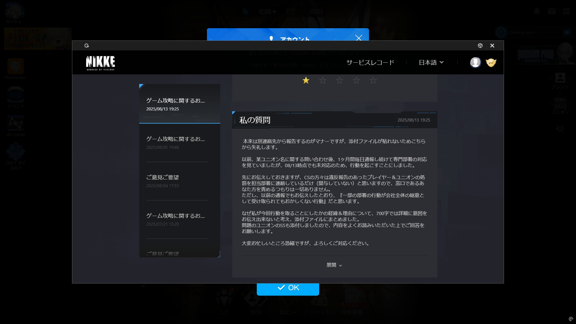 ・管理人は、最初『ユニオンの通報機能』があることを知らず、とりあえずその人物(メンバー)を通報 → 数回通報 & 約1週間ほど様子を見ても何の変化もなかったため、「もしかしてやり方が間違っているのか?」と思い、今度はユニオンリーダーを通報後、以下SSのようにCSへ連絡しました(そもそもそのユニオンメンバーから粘着行為 or 嫌がらせなどを受けたわけではないため、担当部署が「何の問題もない」と判断 & お咎めなしは当たり前だったわけです)。