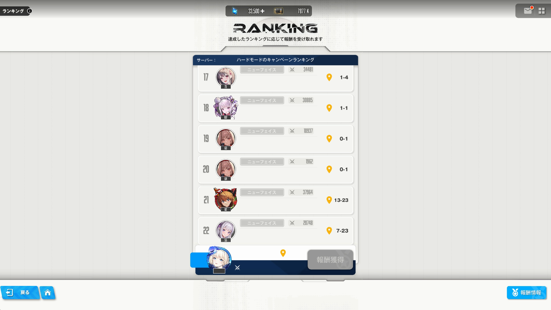 ・直接担当部署に通報したため、CSに連絡後の証拠となる履歴は残っていない & 正確な日時は失念しましたが、8月下旬頃に以下SSの件について報告したものの、いまだに未対応です → ご覧のとおり、管理人がプレイしているサーバーのハードモードランキングで、21位の中国人プレイヤーの挑戦履歴が皆無にもかかわらず、なぜかノーマルステージクリアの数値に近いデータが反映されています(22位も全く同様の状況)。